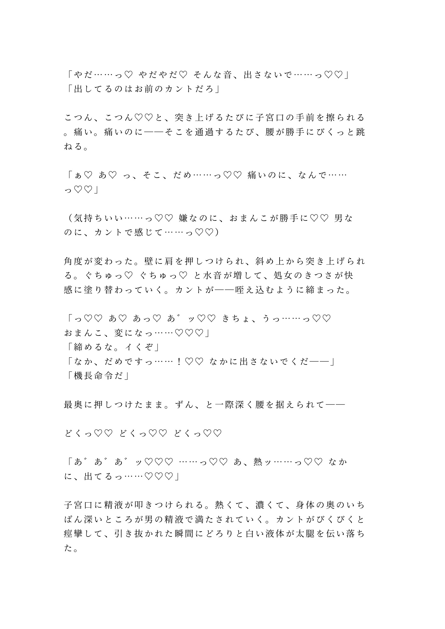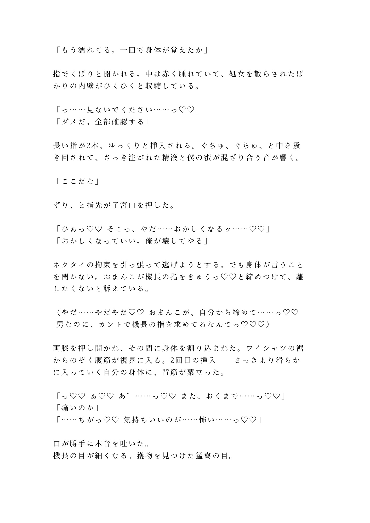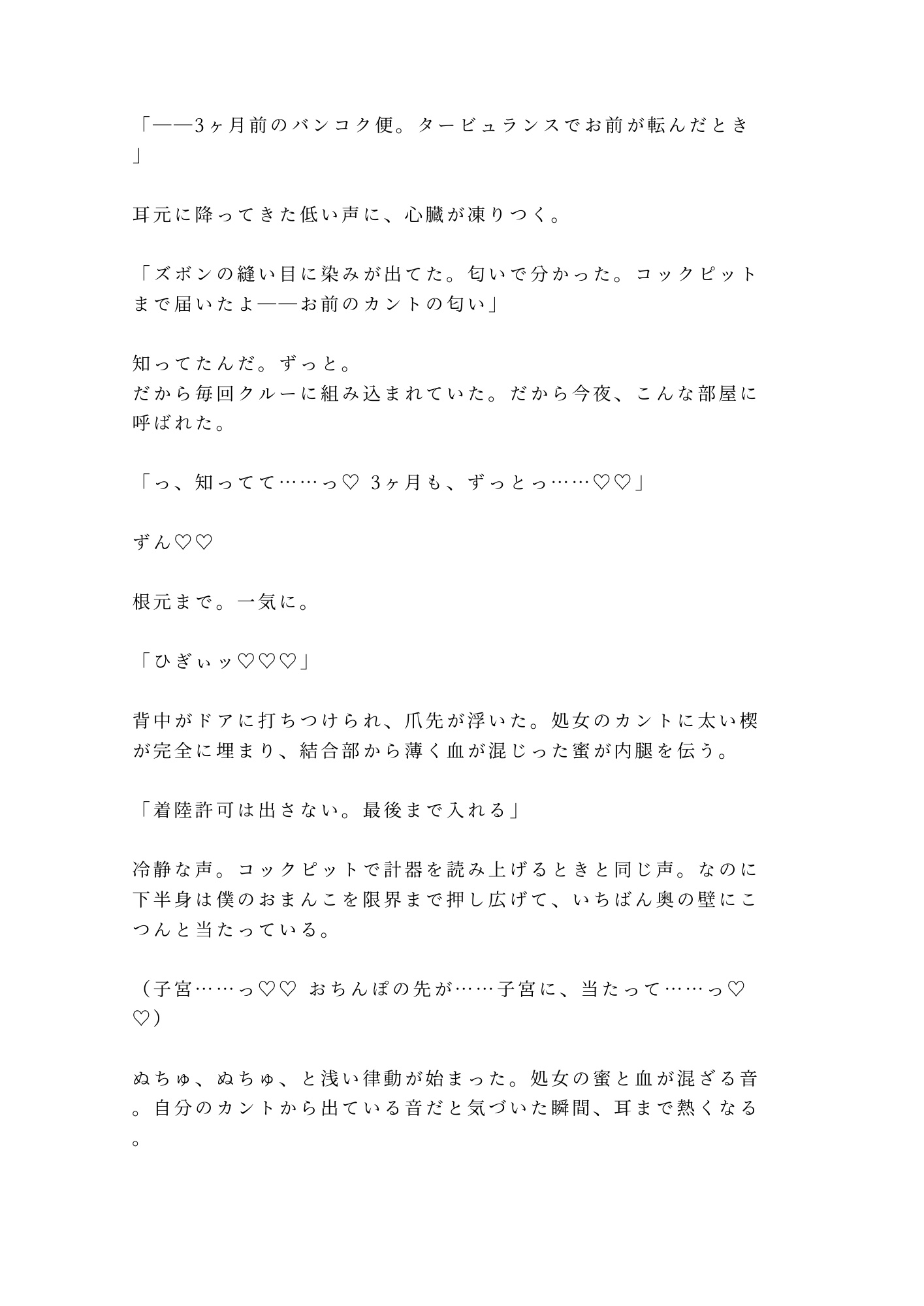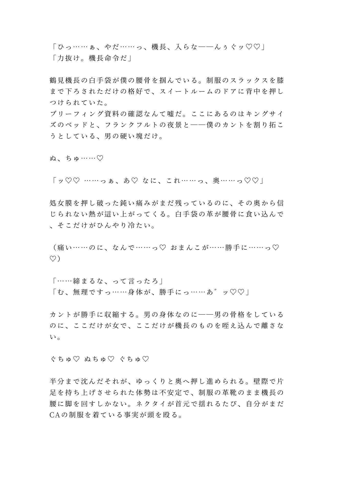 新人CA×エリート機長。レイオーバー先のスイートルームで、白手袋のまま処女を奪われた。「機長命令だ」——逆らえるはずもなく、制服姿のまま最奥を穿たれ、初めてのカントに六回分の精液を注ぎ込まれる。痛みが快感に塗り替わるたび、男の身体が女に堕ちていく。12時間のレイオーバーが終わる頃、新人CAの理性は跡形もなく壊れていた