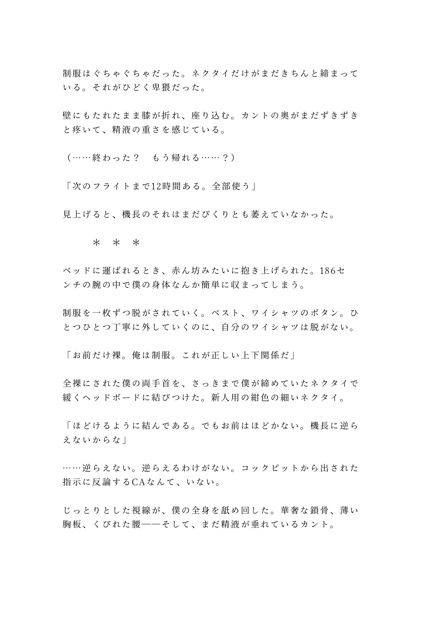 コックピットでは冷静沈着、クルーからの信頼も厚い完璧な機長。その男が制服を一切脱がないまま、僕だけを全裸にして組み敷く。計器を読み上げるように正確に身体の反応を観察し、どこを突けばどんな声が出るか、すべてを把握していく。逃げ場はない。新人用のネクタイで手首を結ばれ、「ほどけるように結んである。でもお前はほどかない」と囁かれる——その通りだった。機長に逆らえるCAなんて、いない。