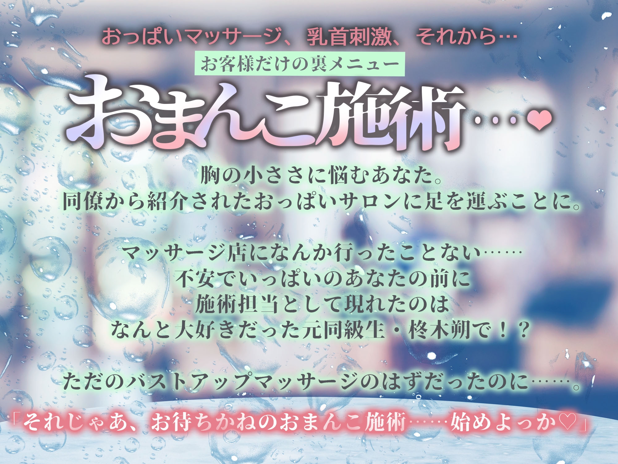 【おっぱいマッサージ、乳首刺激、それから…お客様だけの裏メニュー、おまんこ施術…♡】胸の小ささに悩むあなた。同僚から紹介されたおっぱいサロンに足を運ぶことに。マッサージ店になんか行ったことない……不安でいっぱいのあなたの前に施術担当として現れたのはなんと、大好きだった元同級生・柊木朔で!?ただのバストアップマッサージのはずだったのに……。「それじゃあ、お待ちかねのおまんこ施術……始めよっか♡」
