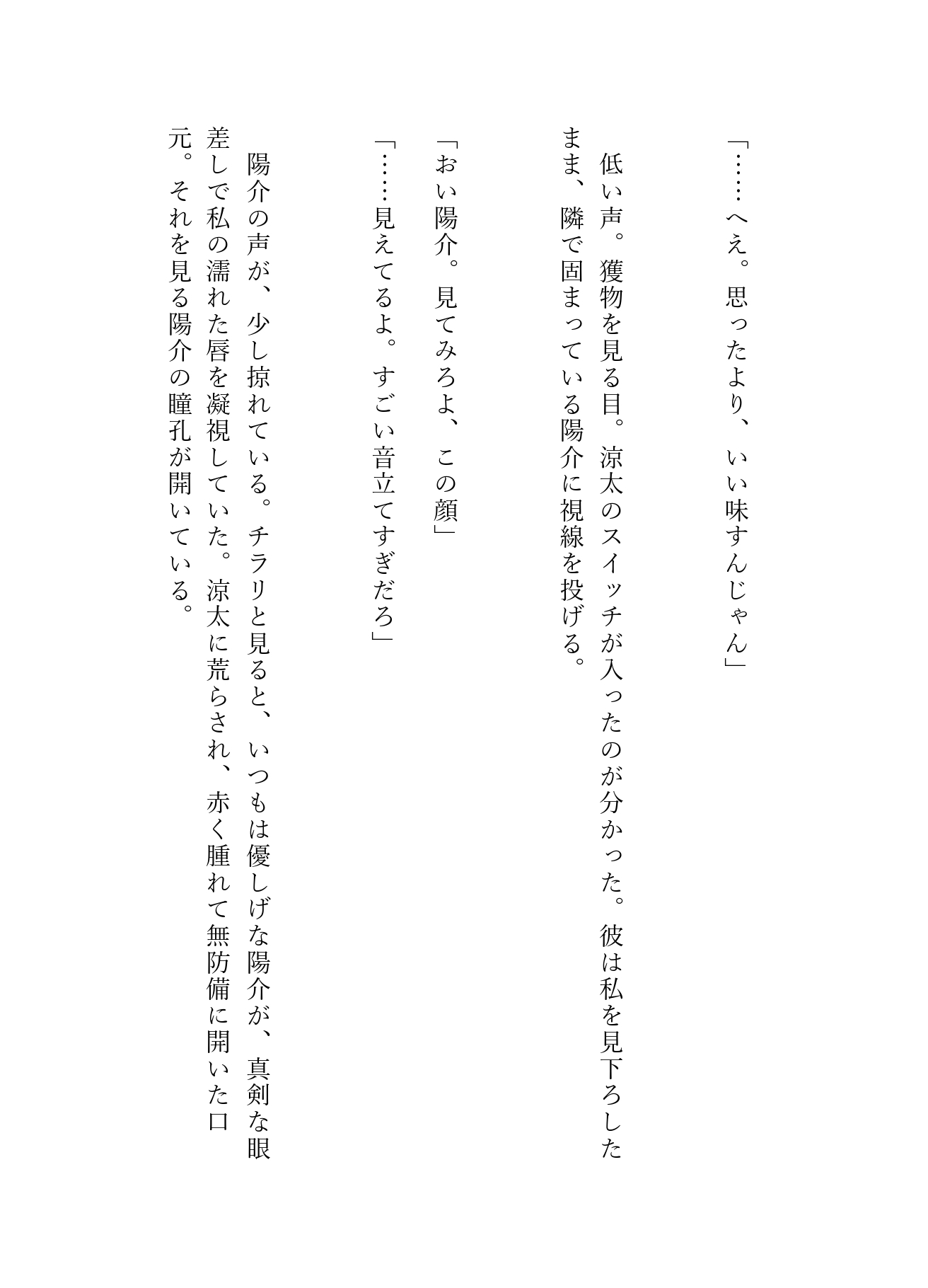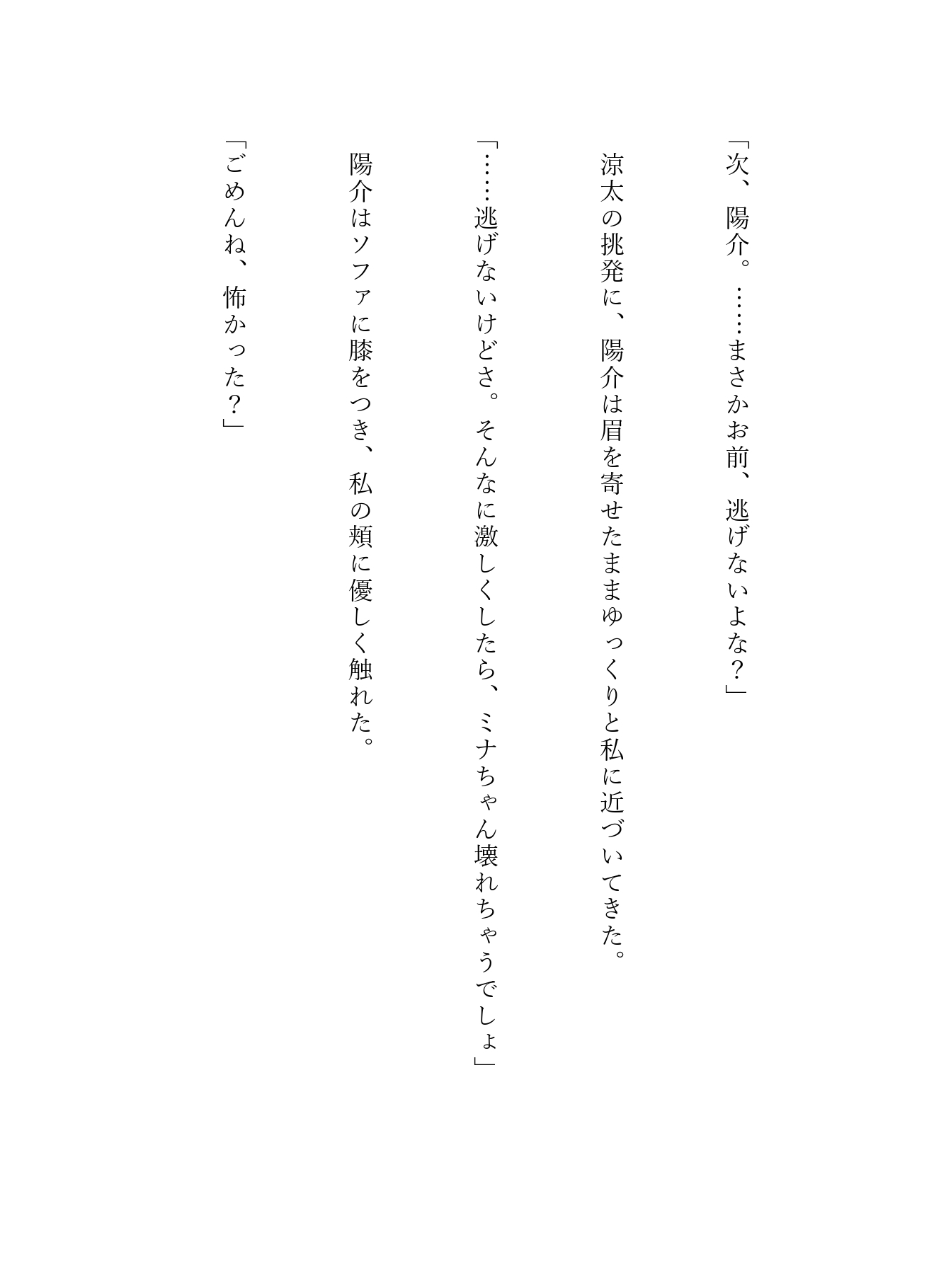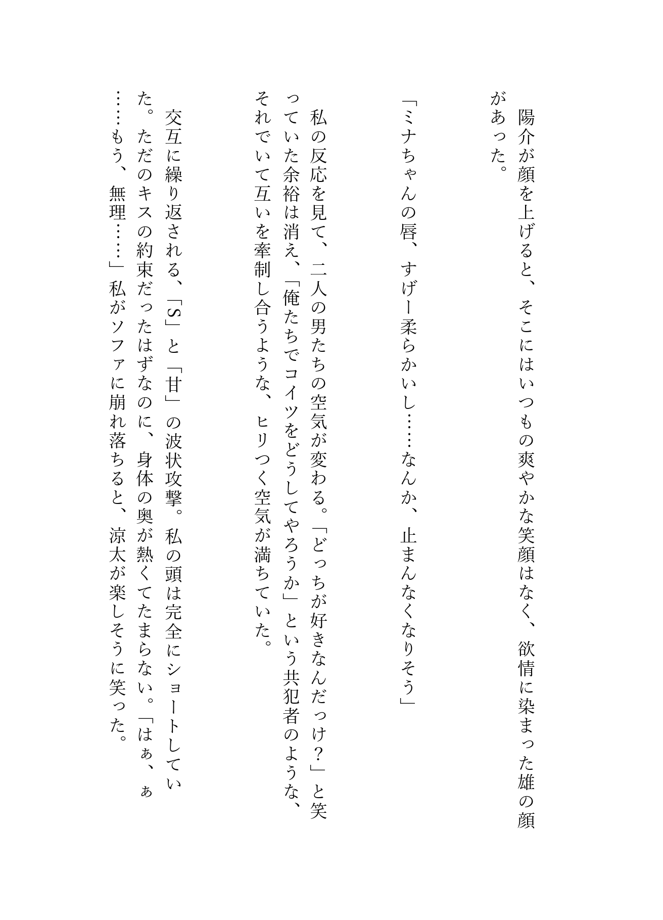 推しのキスが見たい一心でマンションへついて行ったミナを待っていたのは、ドSな涼太と、甘く執着する陽介による、逃げ場のない濃厚3Pセックスだった――。