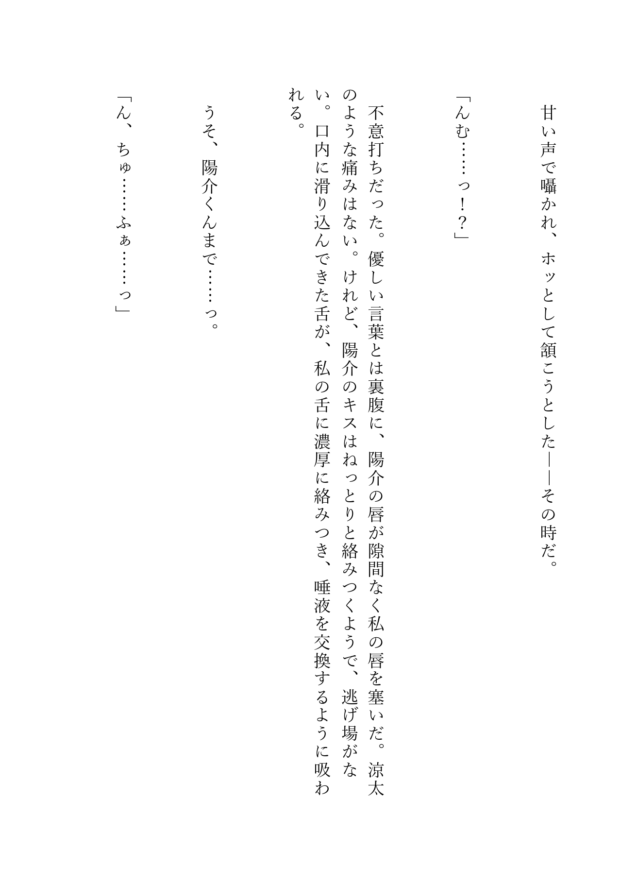 「俺たちとキスして、俺らを満足させられたら……ご褒美に、お前の目の前でこいつ(陽介)とディープキスしてやるよ」