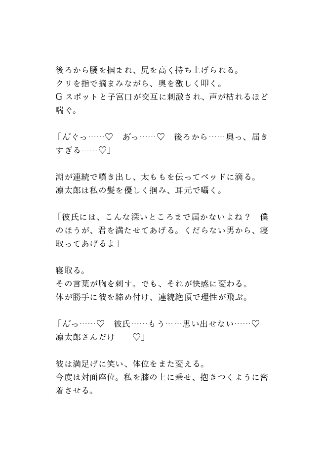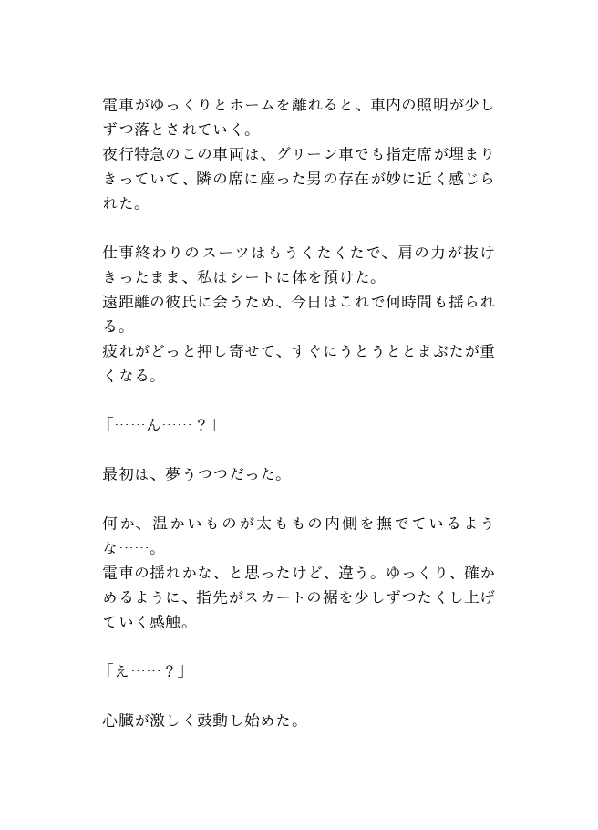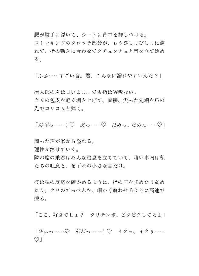 仕事帰りの疲れた体をシートに預け、遠距離の彼氏に会いに行くはずだった夜。 うとうと眠りに落ちかけた瞬間、太ももに温かい感触が……。 隣の男――マスクとキャップで顔を隠した彼は、なんと人気アイドル・凛太郎だった。