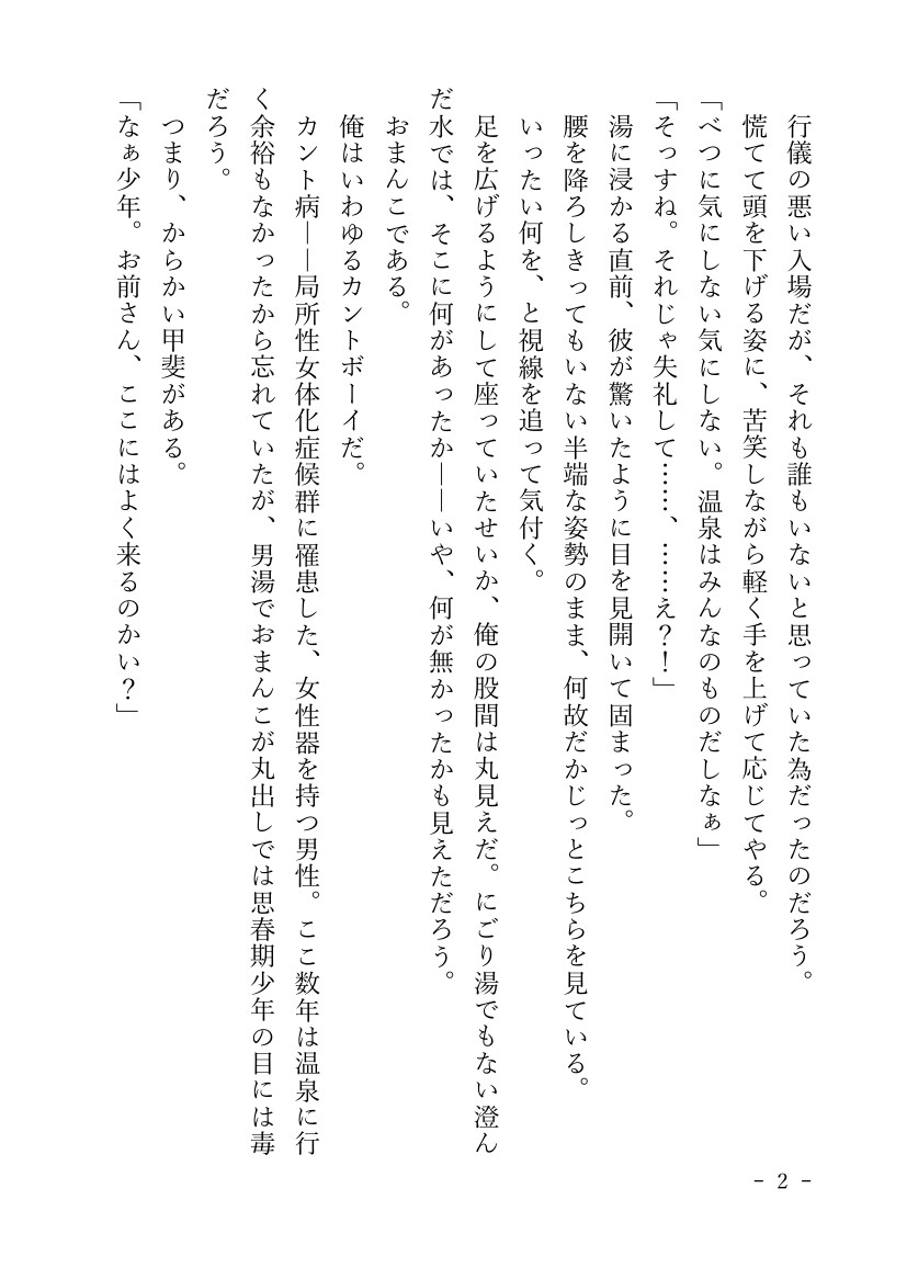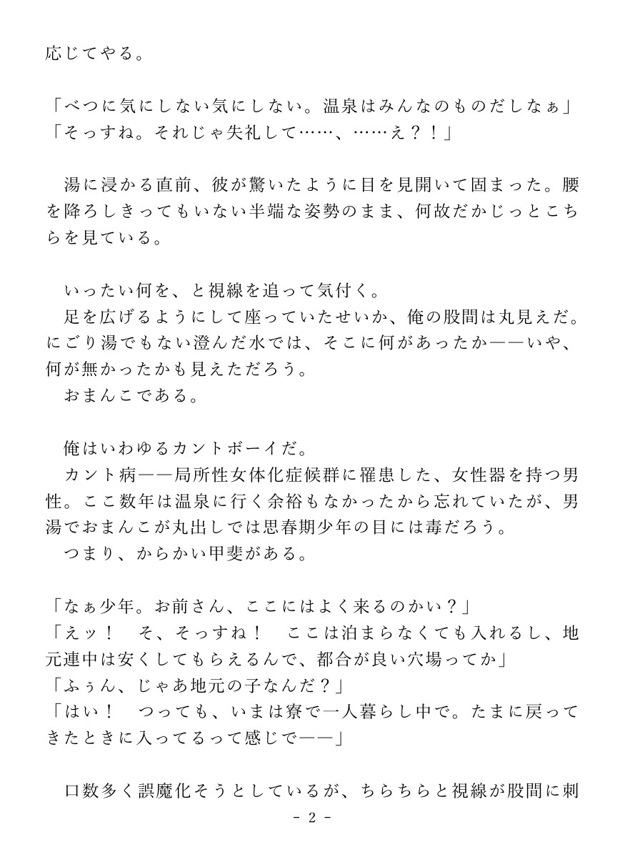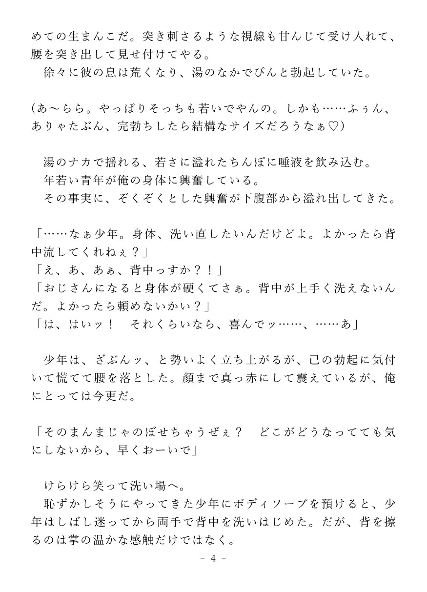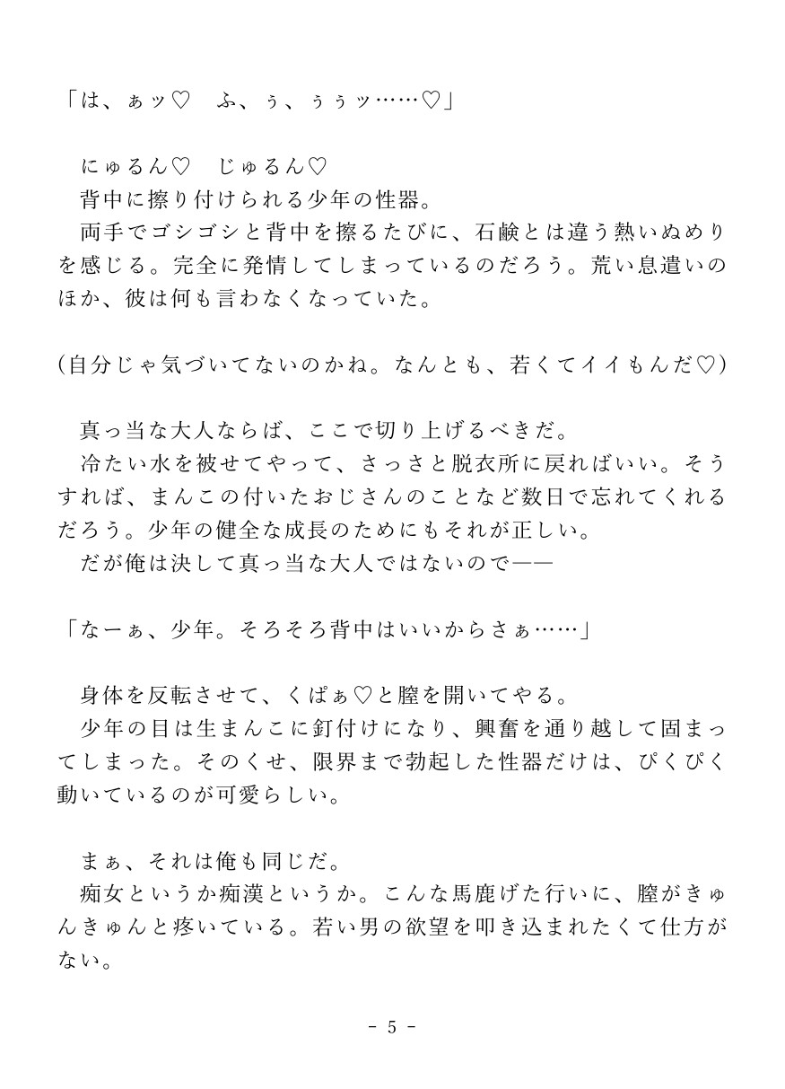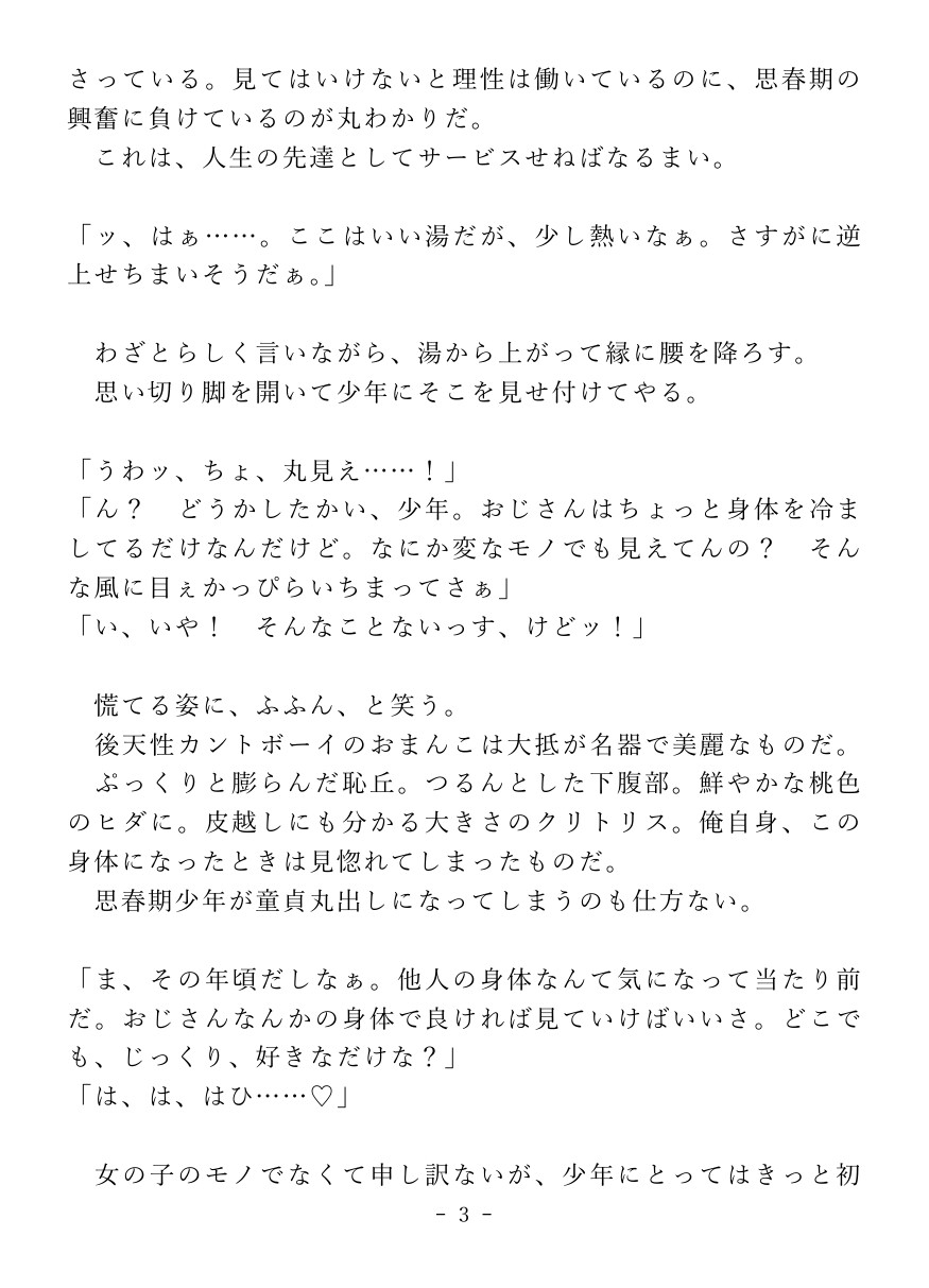 男湯で純情少年におまんこを見せ付け、逆レ○プで搾り取っちゃう淫乱カントボーイおじさんのお話です。
