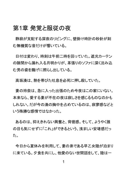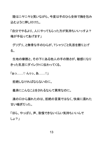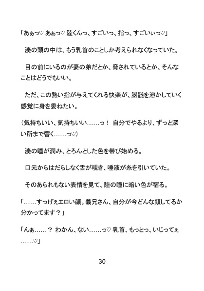 ある夏の日、妻の出張中にリビングで一人、Tシャツを捲り上げて乳首を弄り、快感にふけっていた湊。しかし、その醜態を泊まりに来ていた義弟・陸に動画で撮影されてしまう 。 「これ、姉貴に見せたらどう思うかなぁ」 社会的抹殺を恐れる湊に、陸は動画を消す条件として絶対服従を要求する。