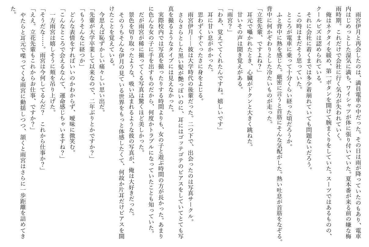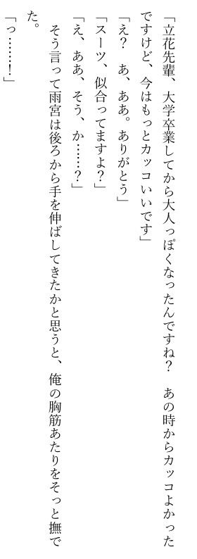 大学時代の後輩に再開し、その場で乳首攻めされイカされてしまうSSです。