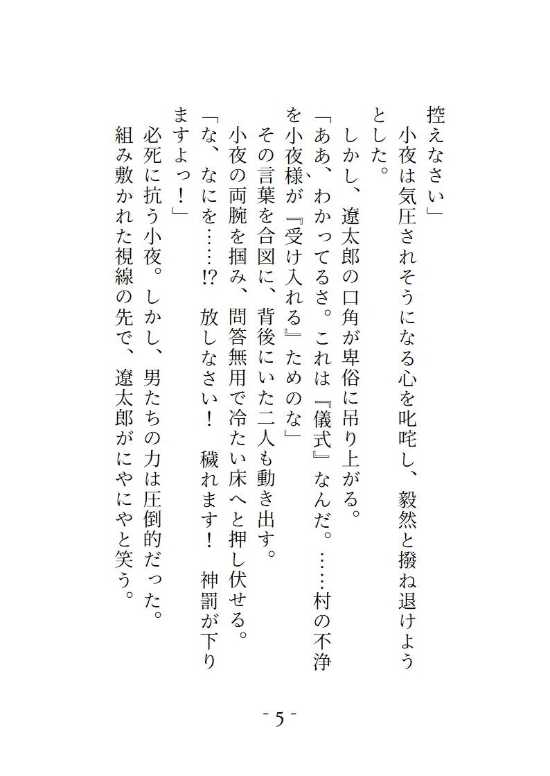 村の巫女である小夜は、村を救いたいという純粋な使命感を胸に、一点の曇りもない巫女装束に身を包んで儀式に臨む。