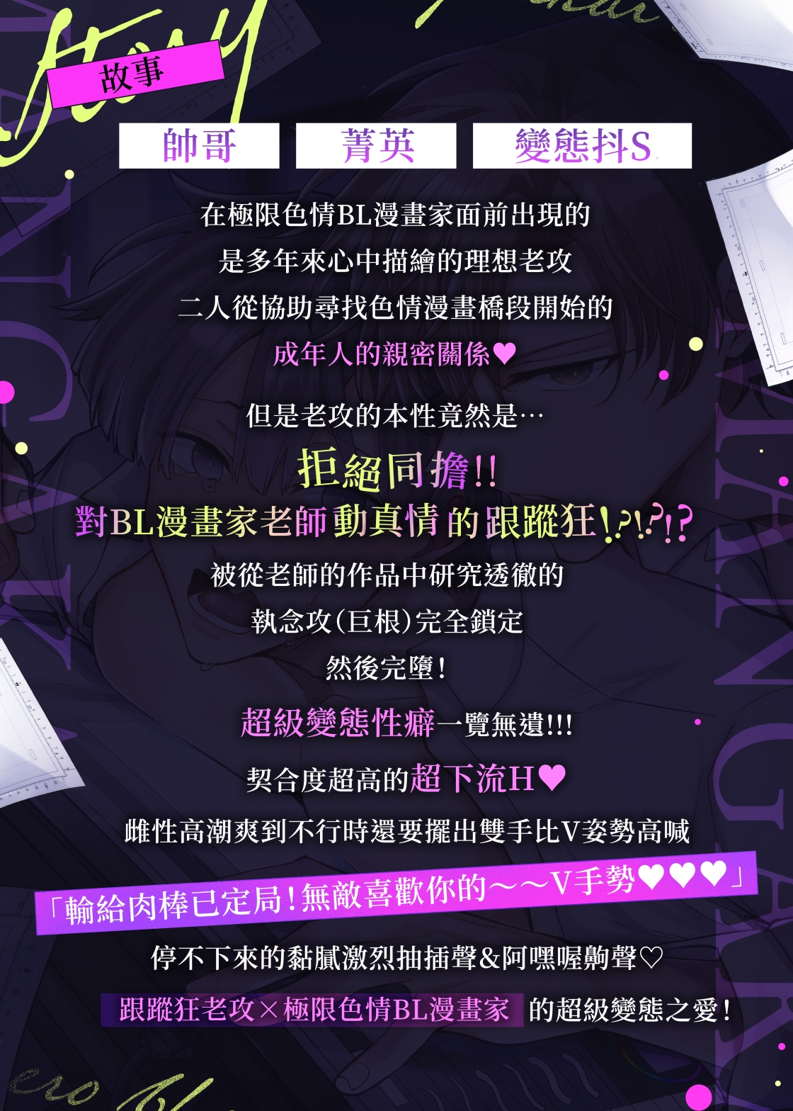 超級變態性癖一覽無遺!!!!契合度超高的超下流性愛♡雌性高潮爽到不行時還要擺出雙手比V姿勢高喊「輸給肉棒已定局!無敵喜歡你的~~~~V手勢♡♡♡」停不下來的黏膩激烈抽插聲&阿嘿喔齁聲♡跟蹤狂老攻×極限色情BL漫畫家的超級變態之愛!