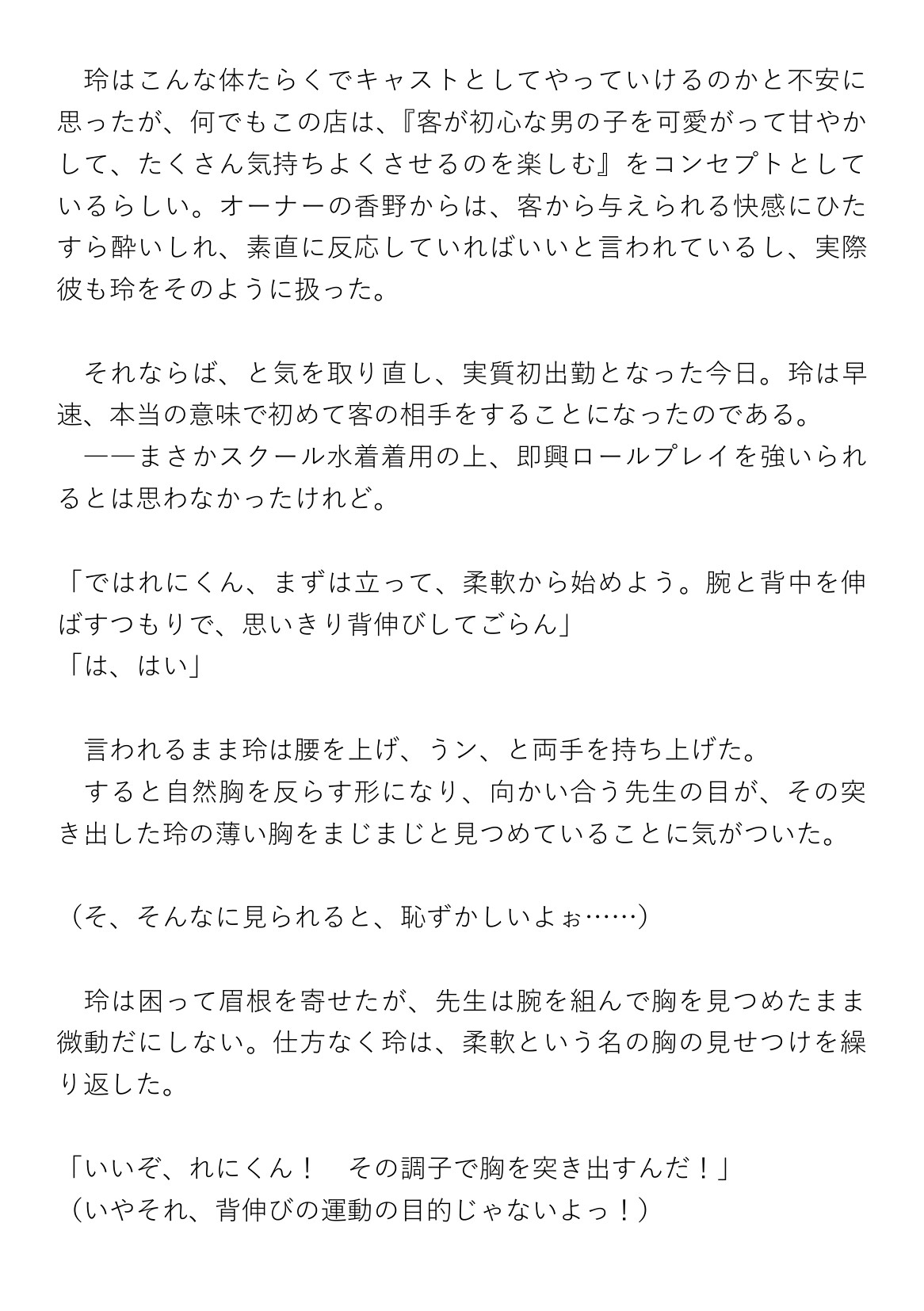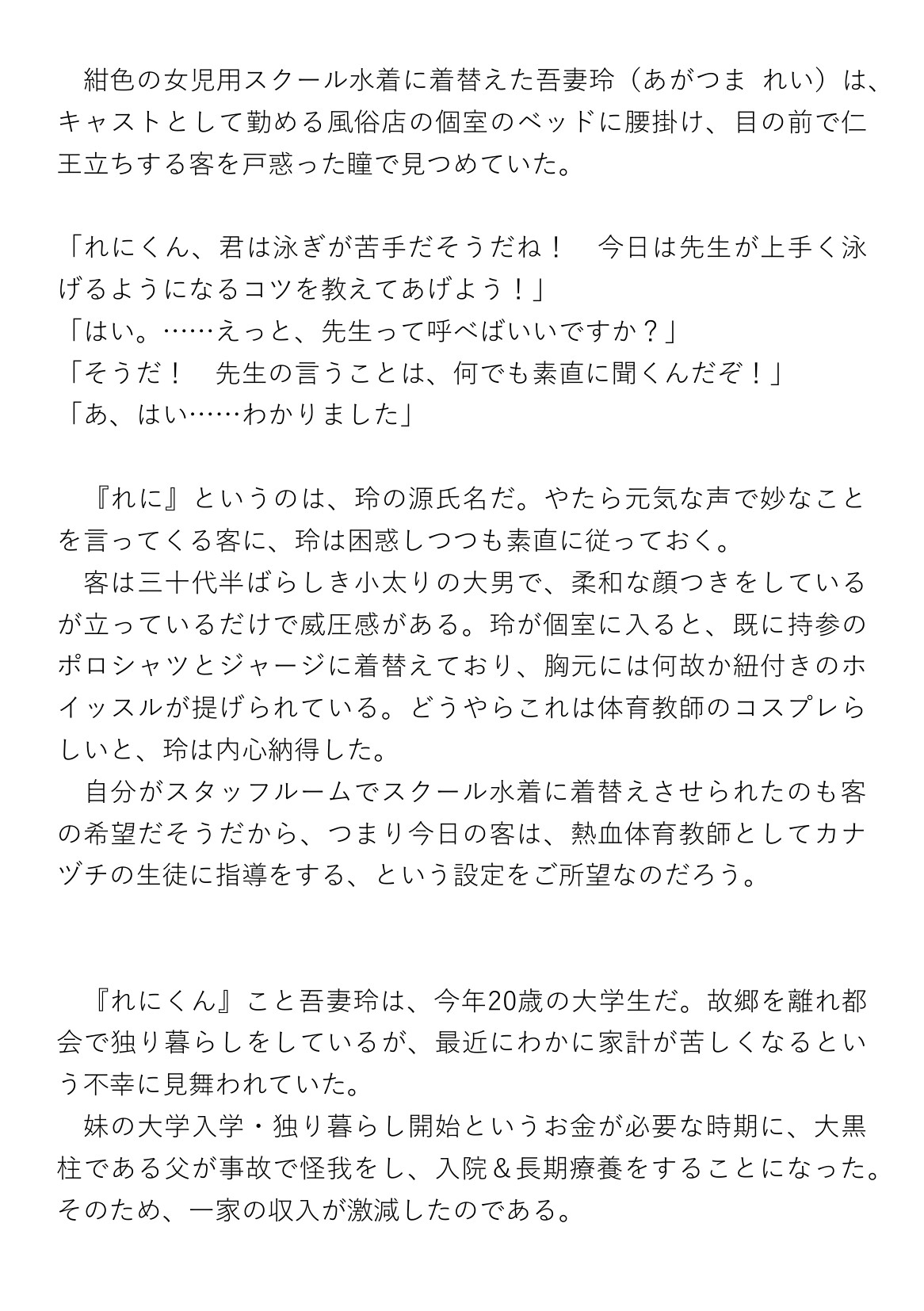 風俗店で働く平凡大学生がモブ客に甘々エロでとろかされるお話。先生×生徒スク水コスプレ着エロ。