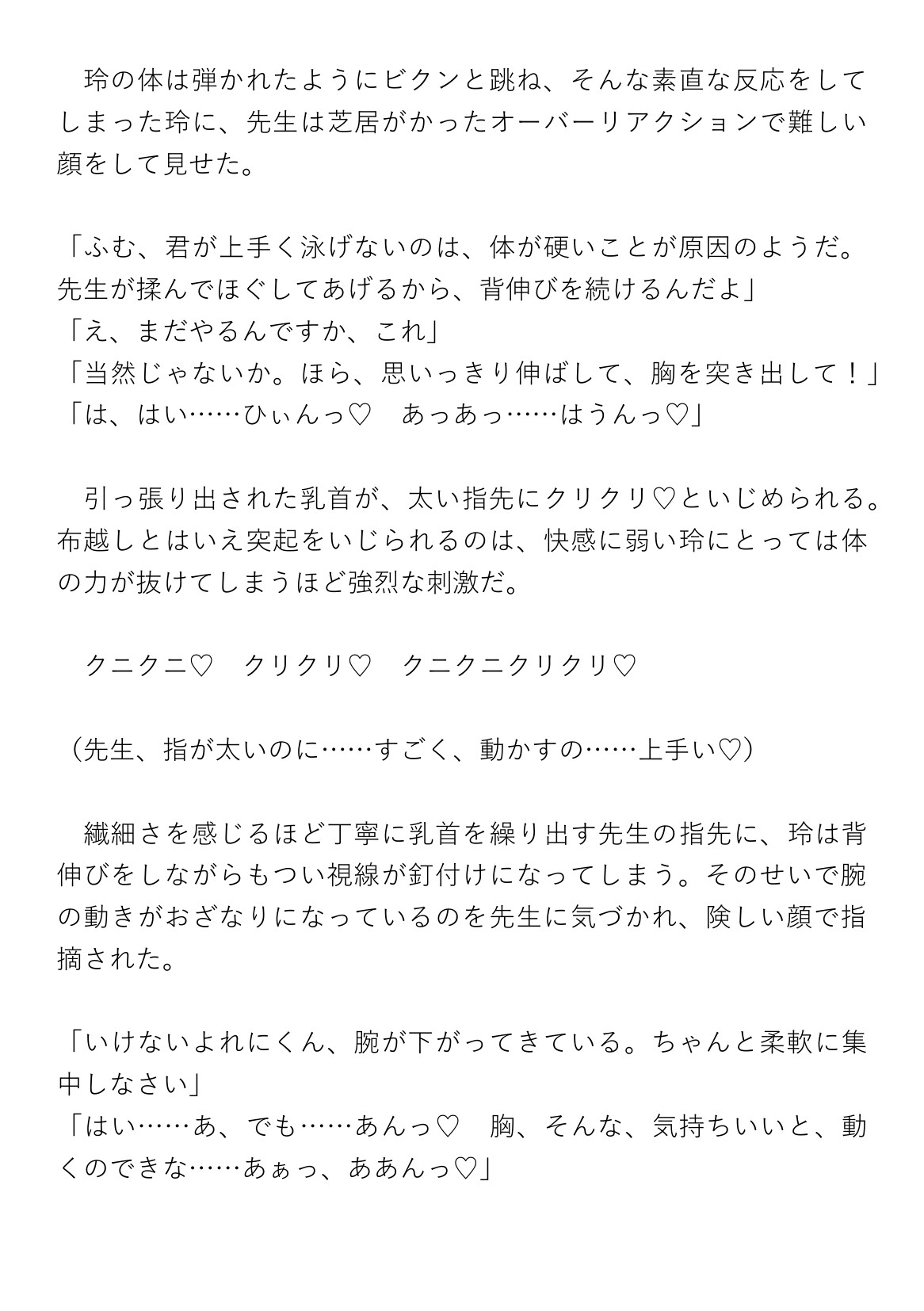 自身を体育教師、「れに」を泳ぎが苦手な生徒と設定し、指導と称してねちっこく快感責めにする。