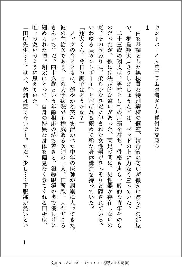 男性の骨格でありながら女性器を持つ特異体質『カントボーイ』の青年・桐島翔太。 自身の身体に悩む彼を救うはずだった特別病棟は、狂気の医師たちが支配する淫らな実験場だった。