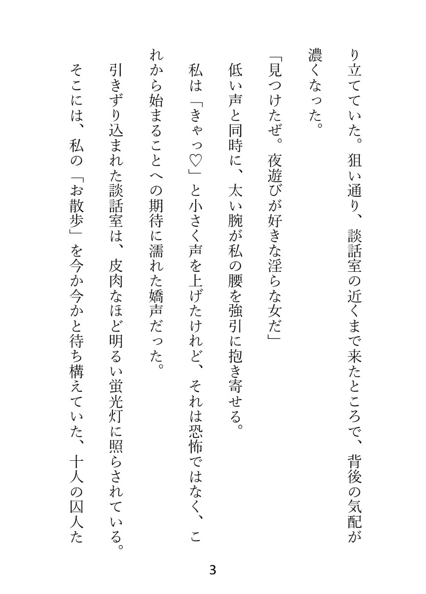 談話室へと強引に「拉致」され、 晒された肌が欲望の視線で真っ赤に火照るなか、彼女は恐怖を期待へと変え、男たちの股間に視線を釘付けにする。