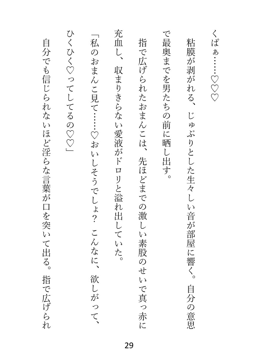 開発され尽くした秘部を自ら左右に引き絞り、粘膜が剥がれるじゅぷりとした生々しい音を響かせて、彼女は十人連続の本気挿入へと身を投じていく。