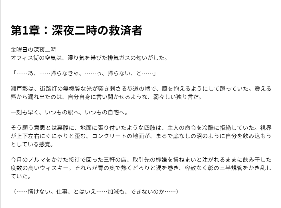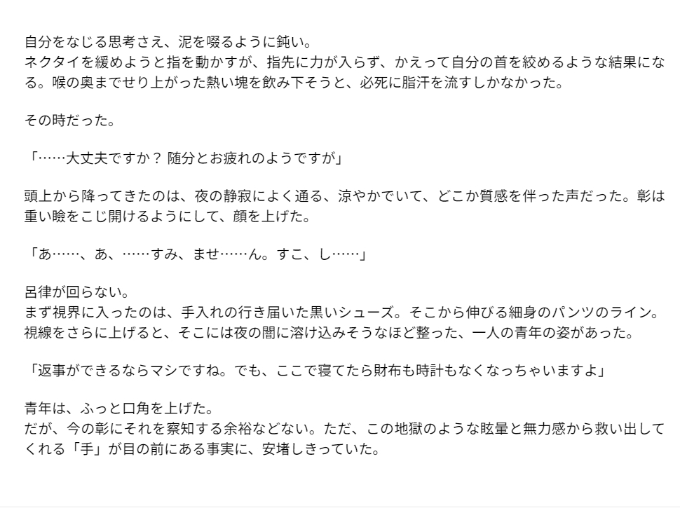 具体的には、プロットの構成案の練り上げや、文章の推敲・表現の検討にAIの支援を受けていますが、物語の執筆および最終的な編集はすべて作者自身の手で行っております。