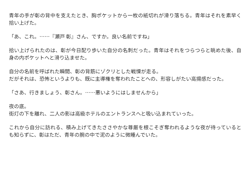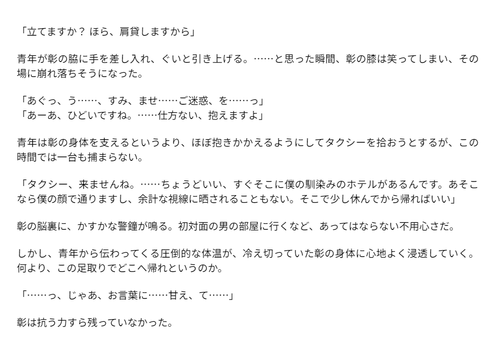 抗う力もなく、その圧倒的な体温に安堵した彰は、誘われるままにホテルの一室へと吸い込まれていく。