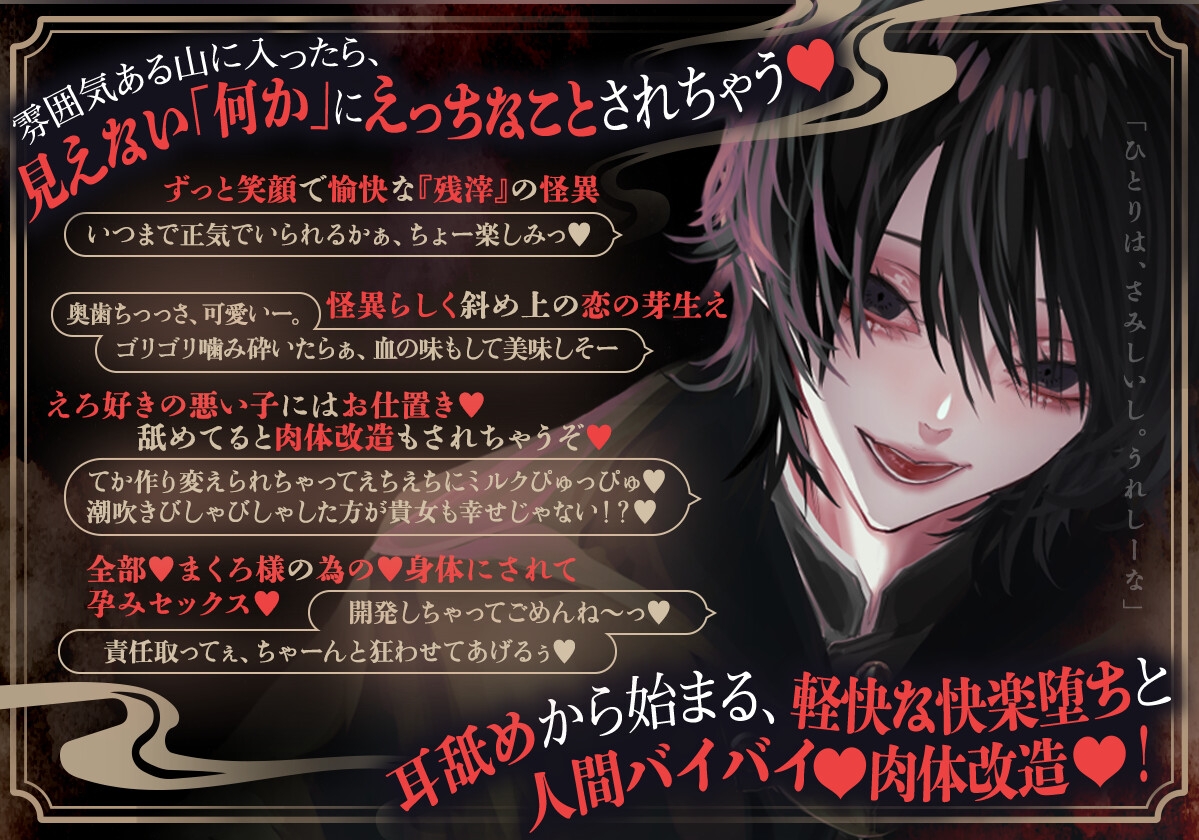 引っ越した先の裏手の山は禁足地らしい。そういうのって少し気になる…、と、好奇心で山に入ってしまう。すると、ずっと繰り返される道、変なものが見えたのに通り過ぎたら、エッチなペナルティ!? 耳舐め、乳首いじり、勃起乳首からの搾乳プレイ!? 気持ちいいに身を任せていたら、徐々に「何か」に体が作り変えられていく…。「僕、可愛いお嫁さんのお迎えしたいな?」家に帰るか、頭が馬鹿になるくらい最高に気持ちいい快楽堕ちか!?