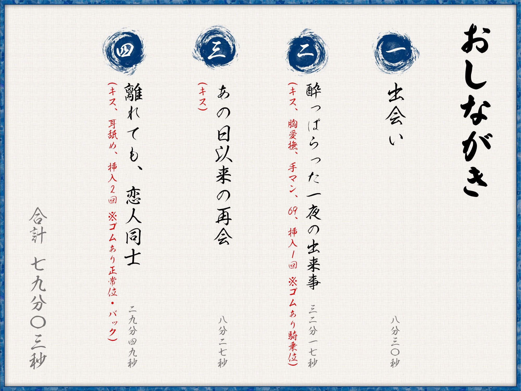 婚約破棄を理由に、一人旅行で広島を訪れた貴女。 たまたまホテル近くの居酒屋で、お店を切り盛りしている島田と出会う。 昨年まで東京に住んでいたという共通点から意気投合した二人は、そのまま酔いと勢いに任せて一夜を共にしてしまう。 先に起きた貴女は、ホテル代を枕元に置き、ホテルを後にする。 帰京日を明日に控えた朝、島田に呼び出され、その日は島田に着いて行くことに。 明日には帰ってしまう貴女に対し、島田の取った行動とは…。