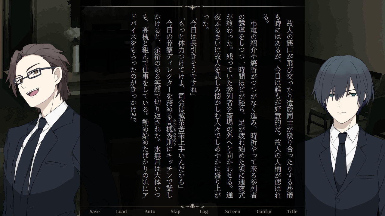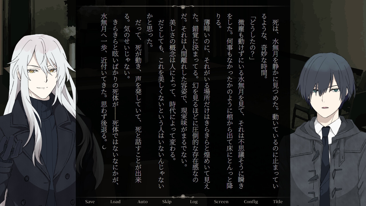 メイン2人の間の受け/攻め/リバを選べる78万字の縦書きノベルゲーム。遺体連続失踪事件が発生する現代東京で、葬儀会社社員の主人公・水無月皐は吸血鬼・アイリと出会い、《箱庭》を巡る争いに巻き込まれていく。絵とオリジナル楽曲で楽しむ『分岐する長編小説』です。