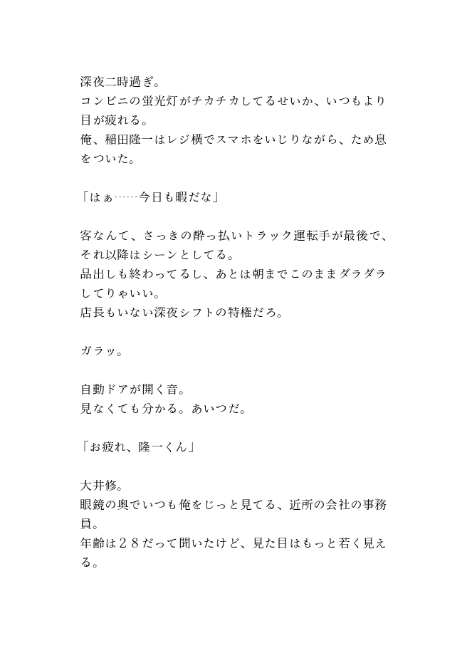 深夜のコンビニバイトで強がるイケメン・隆一。