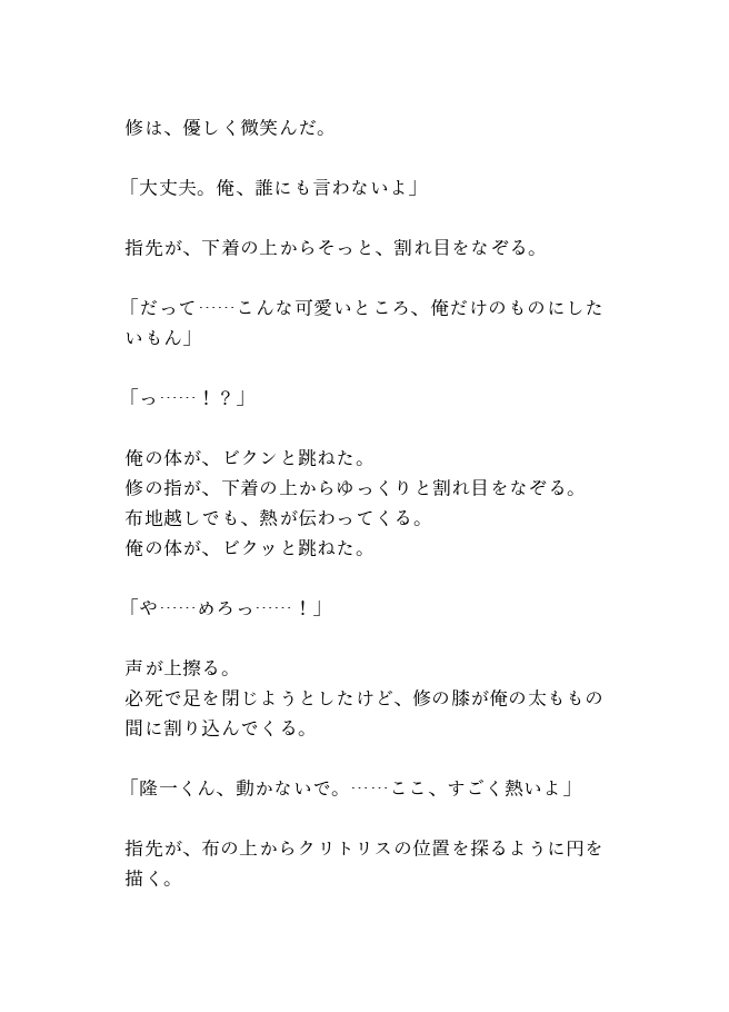 深夜のコンビニバイトで強がるイケメン・隆一。 誰にも知られてはいけない“カントボーイ”の体質を隠し、普通の男として生きてきた。 しかし、眼鏡の地味イケメン常連・修にシフトを監視され、バックヤードで倒れた瞬間―― 秘密がバレてしまう。優しい言葉と執拗なクリ責め、素股、中出しで開発され…… 強がりだった隆一は「俺は修さんのメスオマンコです……♡」とメス堕ち宣言してしまう。