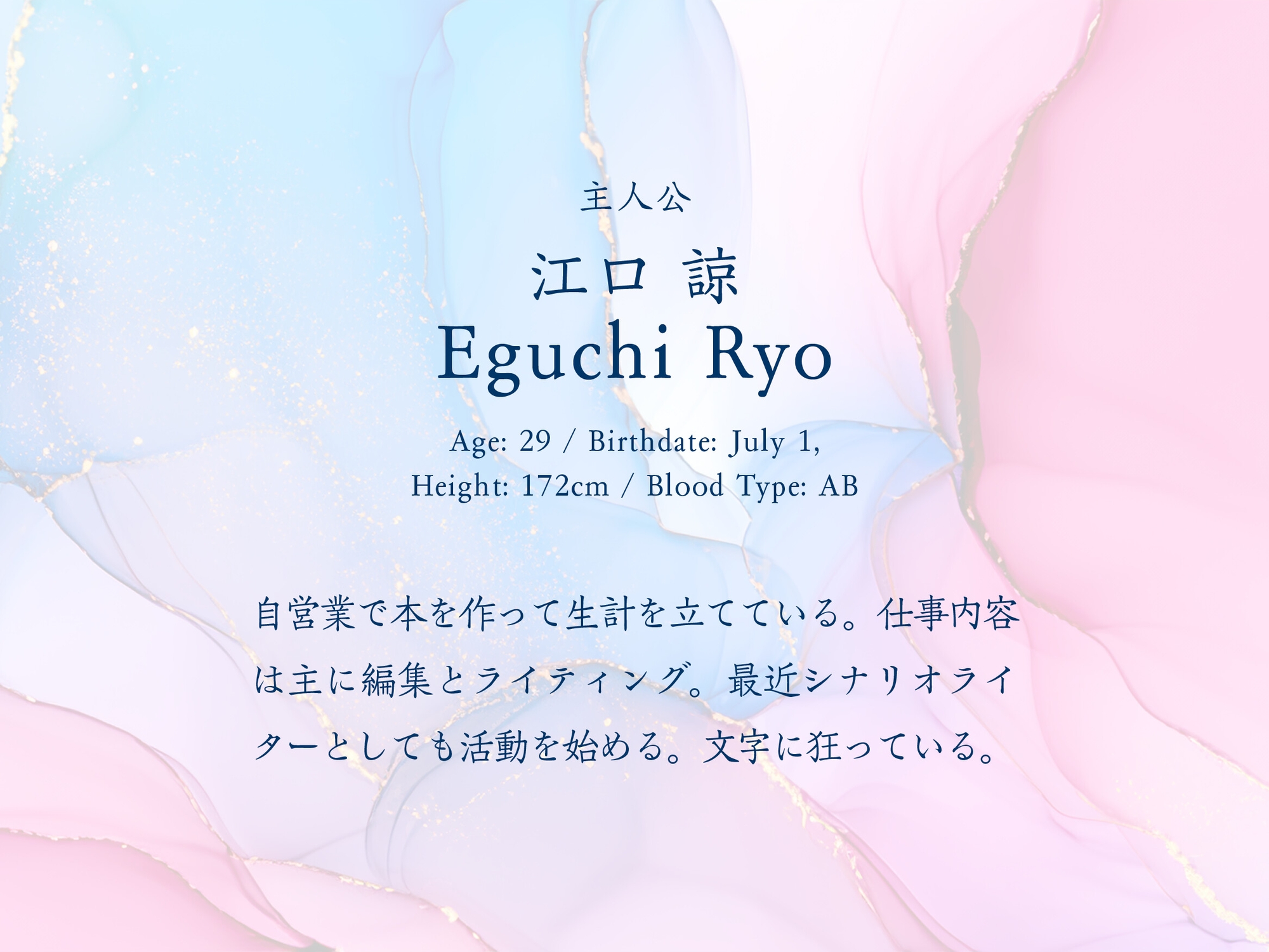 編集やライターなど、本作りに携わる仕事をしている。家が職場。趣味でシチュエーションボイスの台本や小説を書いている。