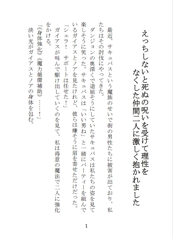 討伐依頼でサキュバスを討伐したその時、サキュバスの呪いで性欲を増大させられた仲間2人。えっちしなければ神経が焼き切れて死んでしまう彼らに主人公は自らの身体を差し出すことを決めた。