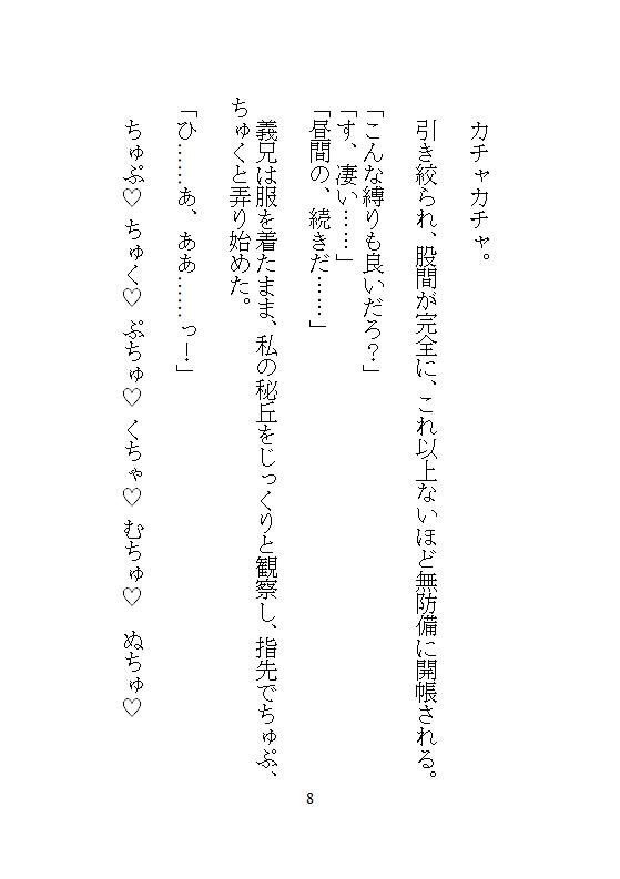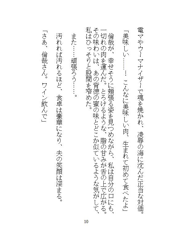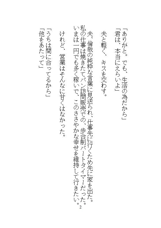 優しい夫である、倫哉との穏やかな結婚生活。唯一の悩みは、パンの訪問販売パートの売れ行きが悪く、家計が苦しいこと。そして、夫の優しい愛撫では、かつて義兄に刻まれた暴力的な快楽を忘れられないこと。そんな私に届いた、会社社長をやっている義兄からの支配的な誘い。