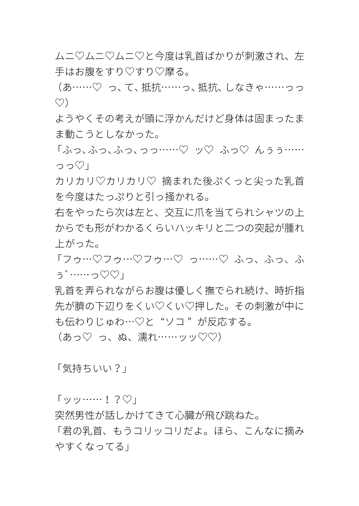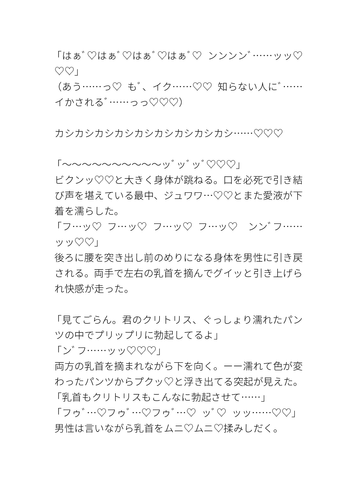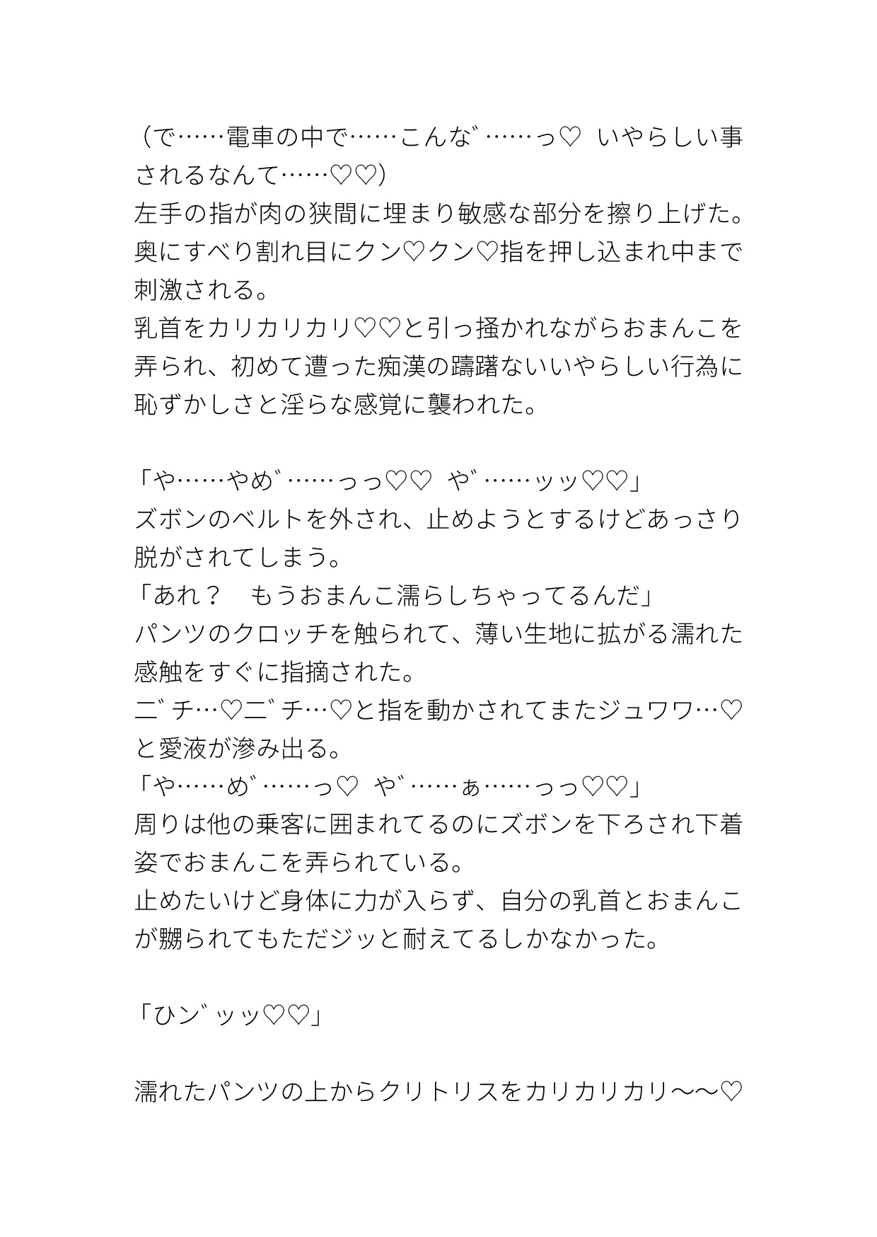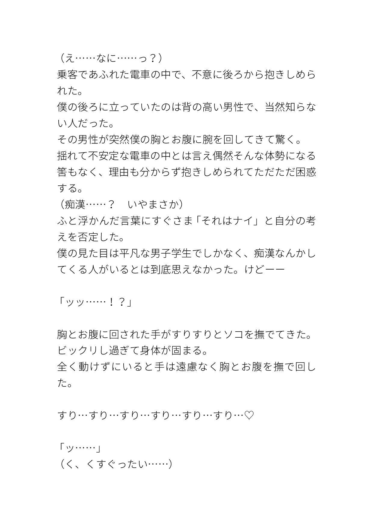 カントボーイがちかんに色々好き勝手にされる話です。 電車の中では乳首を弄られながら言葉責めされたり、素股されて精子をおま○こにかけられたり、その精子をクリや中に塗り込まれてイかされたりします。 挿入はホテルでされます。