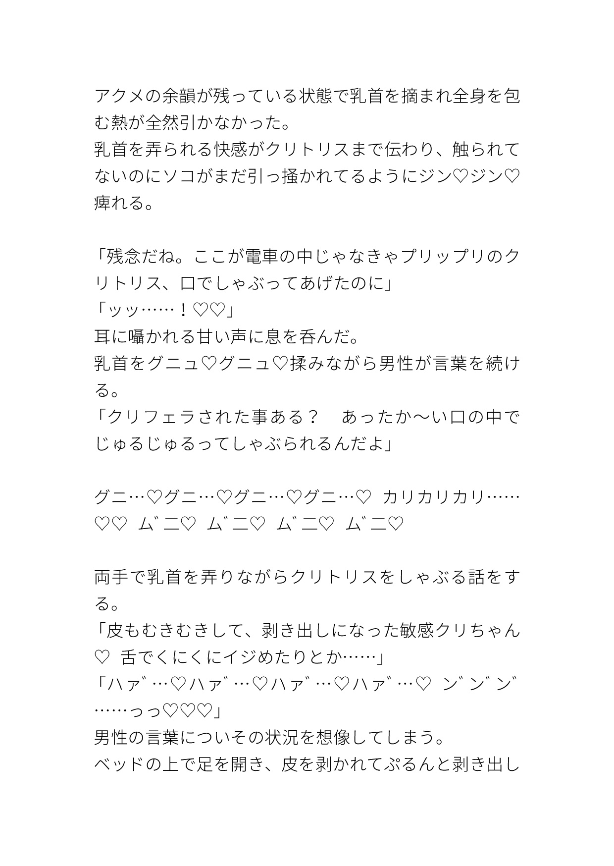 電車の中では乳首を弄られながら言葉責めされたり、素股されて精子をおま○こにかけられたり、その精子をクリや中に塗り込まれてイかされたりします。