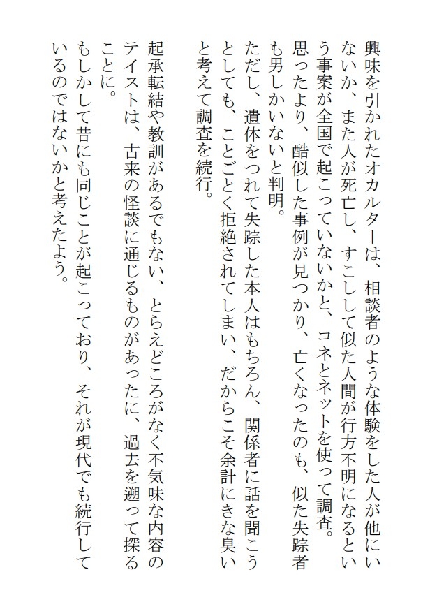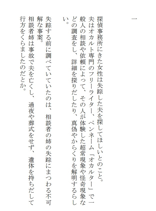 謎だらけの事案について調べていたオカルト専門のフリーライターも失踪してしまい、元警察官の探偵が探すことに。