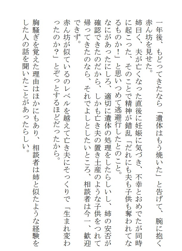 遺体を持ちだして失踪した女が、赤ん坊をつれてもどってきた。