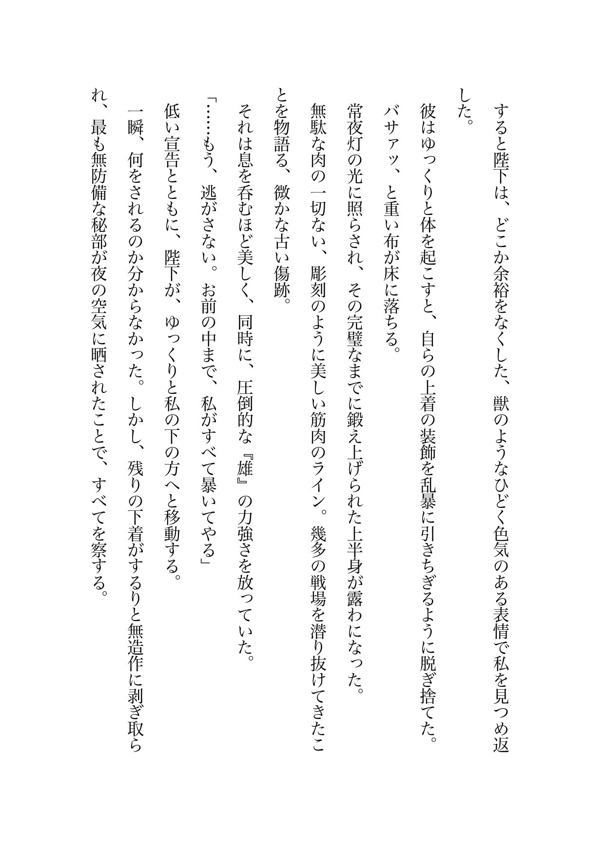 普段の冷徹な仮面を完全に脱ぎ捨て、「雄」としての熱と独占欲を剥き出しにして迫る陛下。