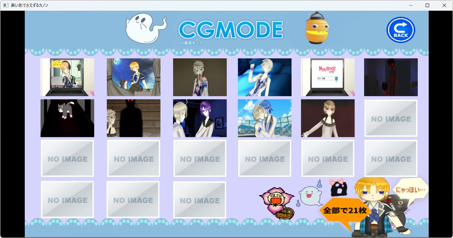全年齢探索BLホラーゲーム。「忘却のカノン」の原型にあたります。マップをクリックして探索するお手軽操作。CG21枚。ボイスあり。6つのマルチエンド。