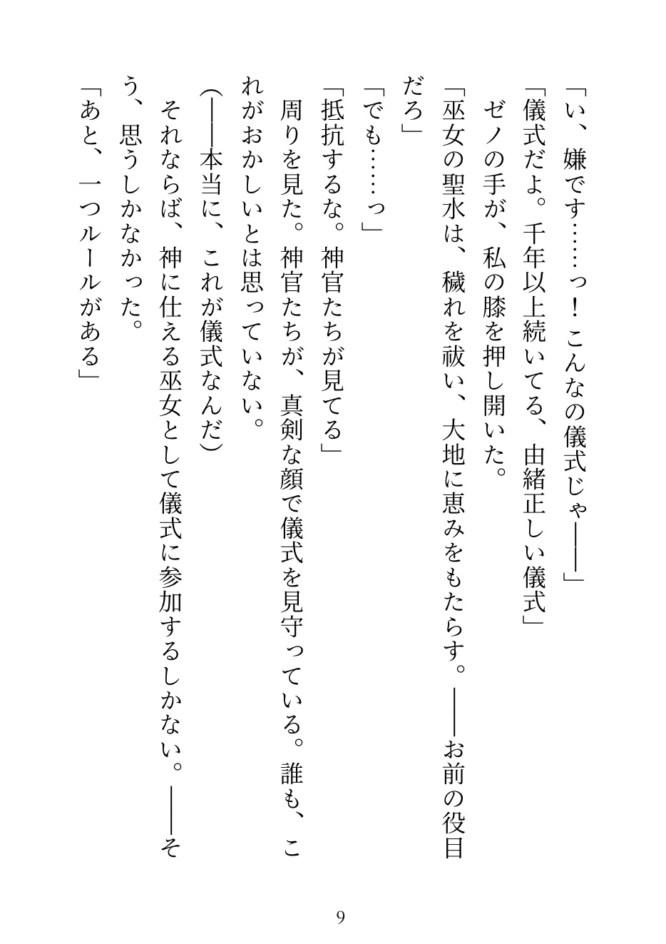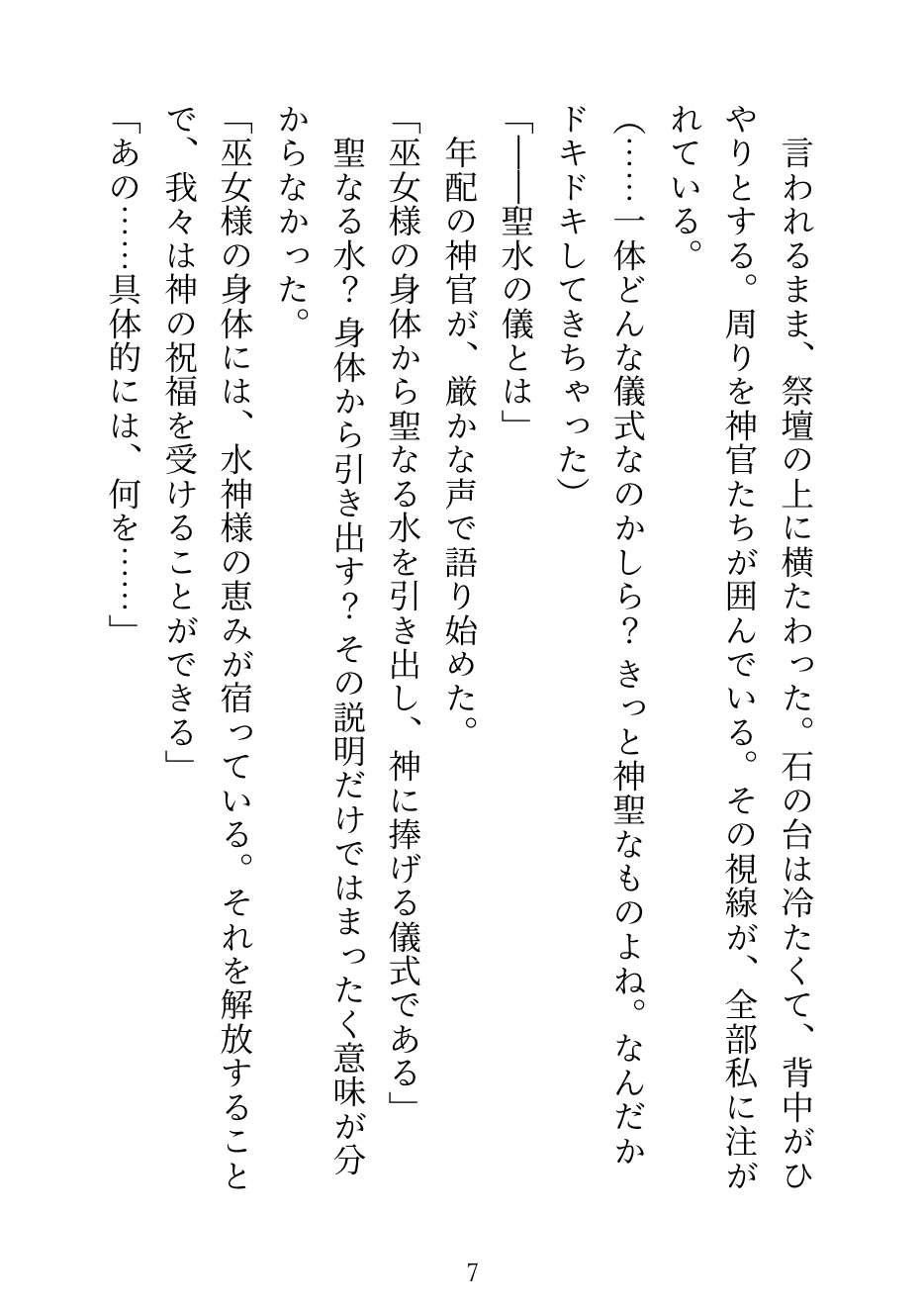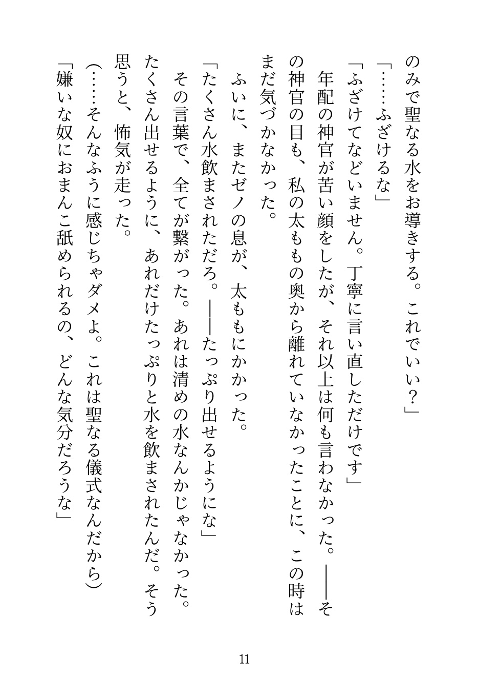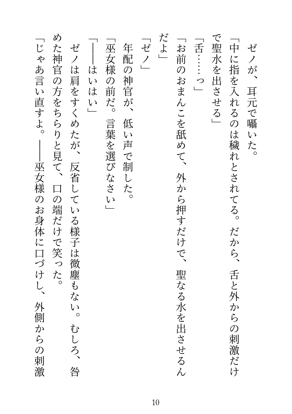 巫女の儀式で大嫌いな神官・ゼノに当たってしまう。中に入れるのは禁止だから、舌と外側だけ。「感じたら負けだぞ、巫女様」——他の神官たちが見守る中、何度も潮を吹かされて、儀式の後は「もう離さない」と執着され……