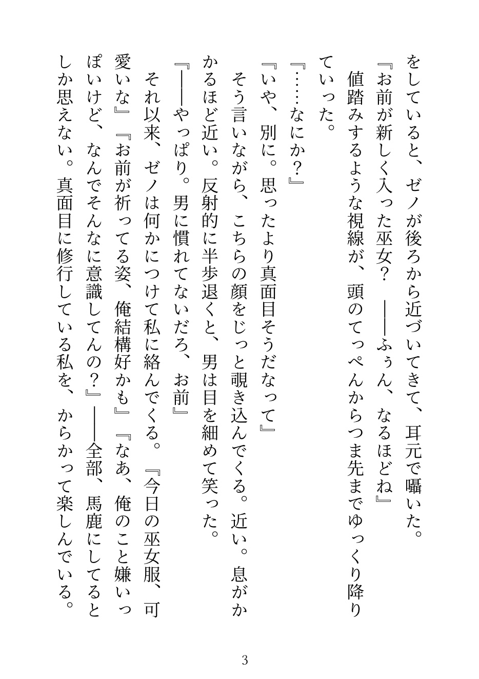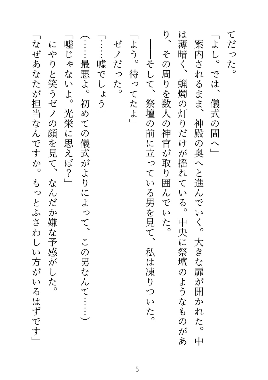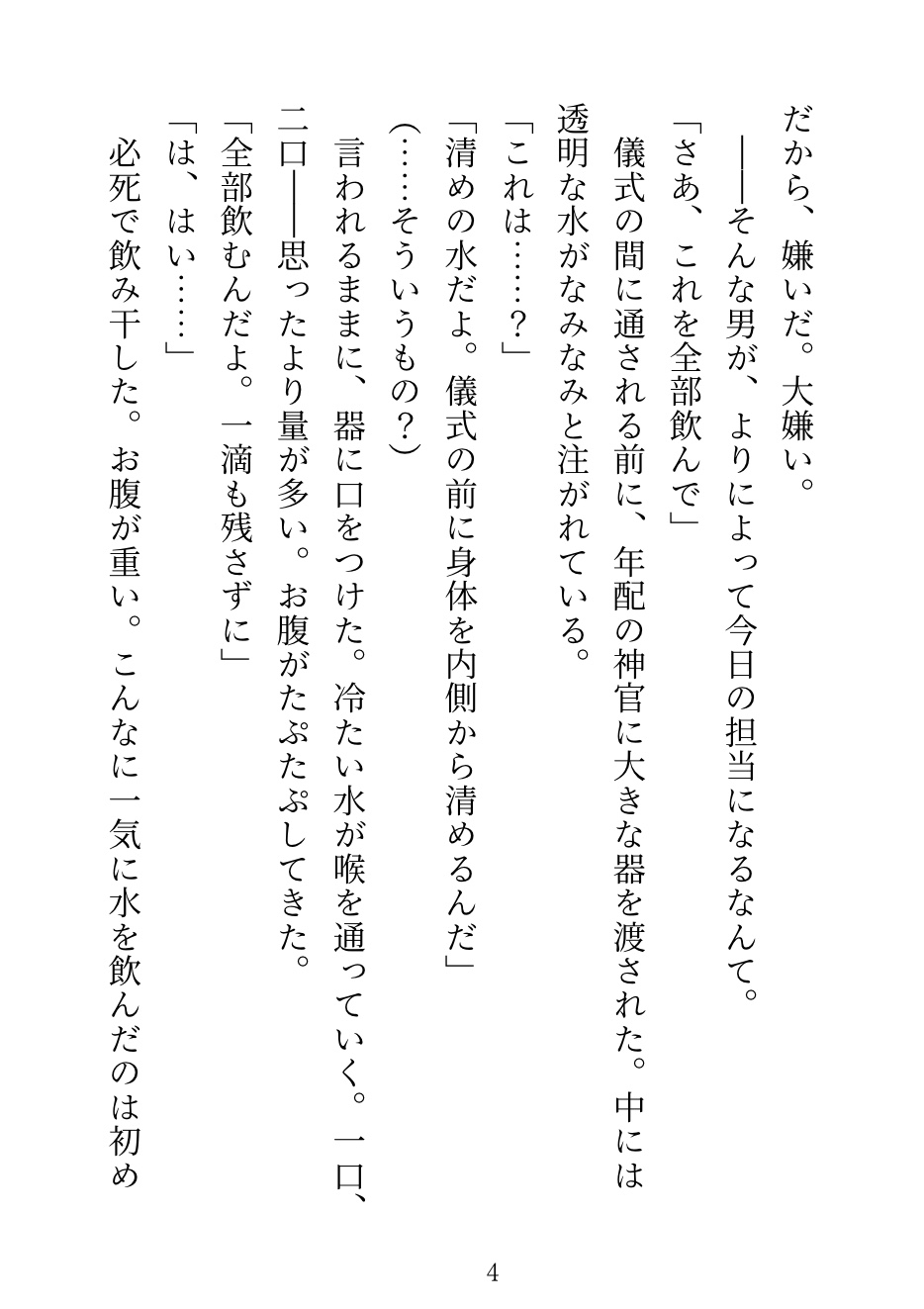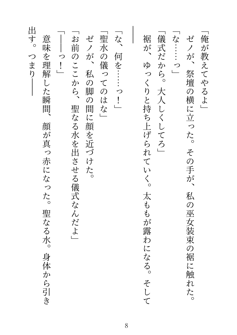 巫女の儀式で大嫌いな神官・ゼノに当たってしまう。中に入れるのは禁止だから、舌と外側だけ。「感じたら負けだぞ、巫女様」——他の神官たちが見守る中、何度も潮を吹かされて、儀式の後は「もう離さない」と執着され……