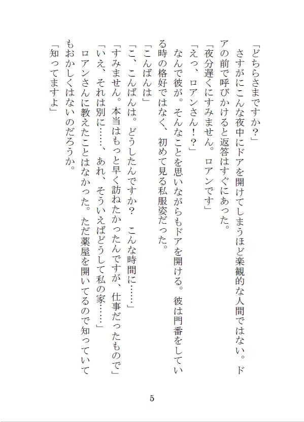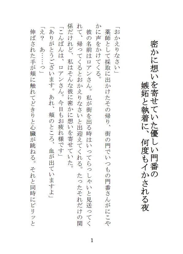 薬師のあなたは門番のロアンに密かに想いを寄せていた。そんなある日、他の男性の話を口に出した瞬間、彼の雰囲気が変わり、その日の夜、家に彼が訪れた。戸惑うあなたと強引にあなたを抱くロアンとの長い夜が始まる。