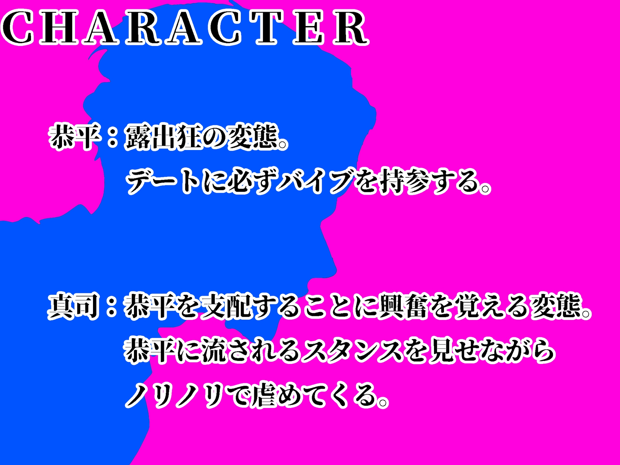 露出癖のある恭平は映画館デートにバイブを仕込んで挑発。真司は呆れつつも主導権を握り、暗闇の中で限界まで追い込み完全支配。理性と羞恥が崩れる背徳の調教劇。