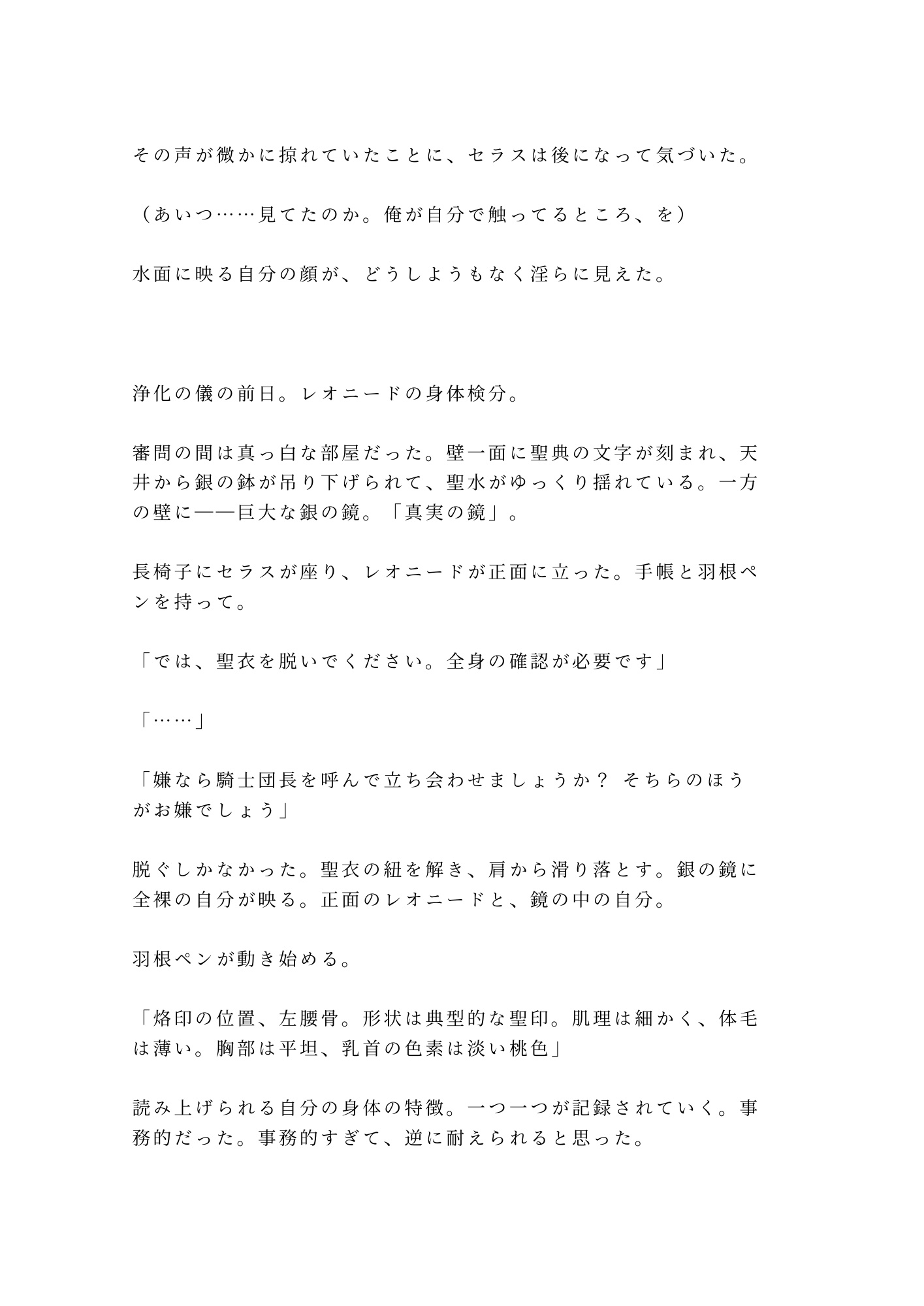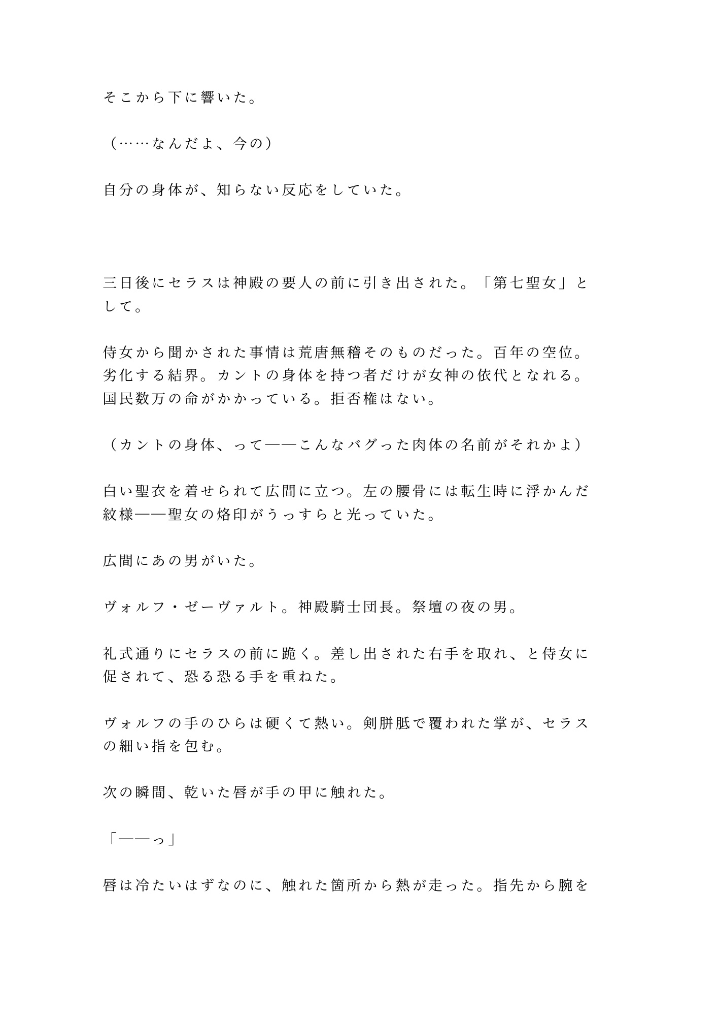 深夜バイト帰りに死んだはずの大学生・瀬良宗介が目覚めると、股間から男性器が消えていた。代わりにあったのは、疼く肉の裂け目——「カント」。百年ぶりに現れた第七聖女として神殿に囚われたセラスを待っていたのは、感情を殺した騎士団長ヴォルフによる「浄化の儀」。祭壇の上で毎夜暴かれる身体、審問官レオニードの甘い検分。触れられるだけで蕩けるカントを持つ元・男は、二人の男の間で堕ちていく。
