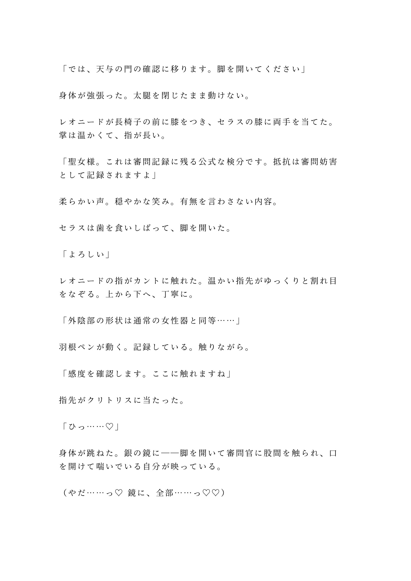 無骨な騎士団長の手と、優雅な審問官の指。神託と職務を盾に、二人の男がセラスの身体を——心を——奪い合う。