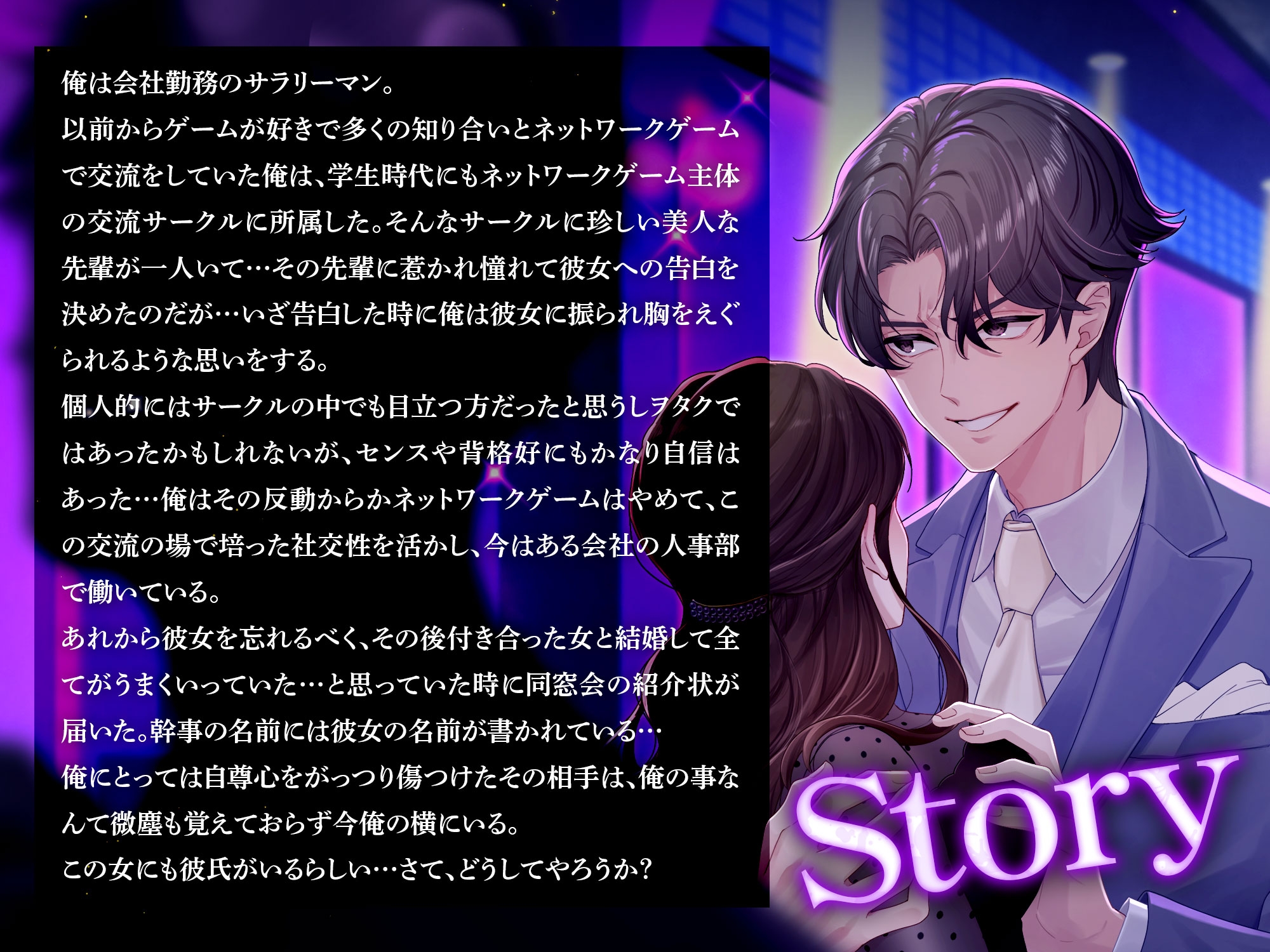 俺はとある会社の人事部で働いている。今日は大学時代のサークルの同窓会に来ていたのだが……そこで思わぬ 収穫があった。 目の前で酔いつぶれているのは、大学生当時、俺のことを振った先輩だ。 話しかけた時は俺のことを憶えていない様子だったが、逆に好都合だったかもしれない、相談に乗った流れでこ の最高の状況が目の前にある。 最近は忘れかけていたが…当時の俺をあんな風に振った代償、今の彼女に払って もらうとするか…