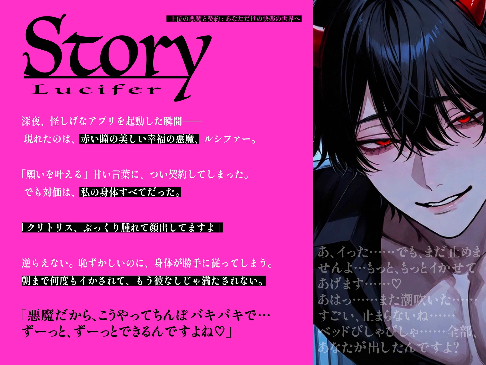 深夜、怪しげなアプリを起動した瞬間—— 現れたのは、赤い瞳の美しい悪魔【ルシファー】。 「願いを叶える」甘い言葉に、つい契約してしまったアナタ。 でも対価は、私の身体すべてだった。 「舌を出して」「自分から腰を振りなさい」 契約で逃げられない、一晩中執着絶頂セックス 「ふふ、こんなに濡らして……私を待ってたんですか? いい子ですね。ご褒美に、朝まで気持ちよくしてあげますよ」