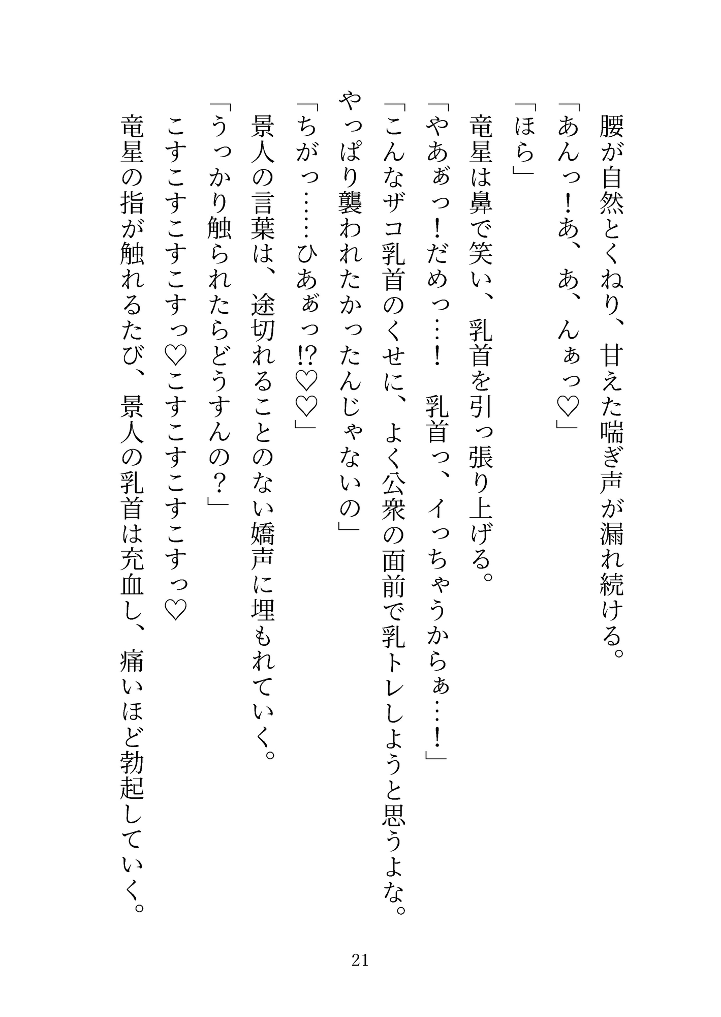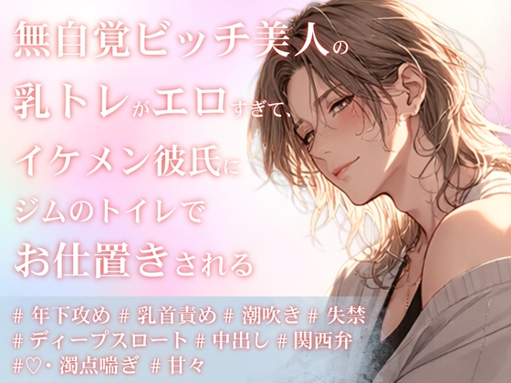 儚げな美貌とエロい体のせいで、無自覚に男を誘惑してしまうビッチ体質の景人(けいと)。頼れる超絶イケメン年下彼氏・竜星(りゅうせい)とラブラブな景人は、おっぱい好きな竜星のためにスポーツジムで胸トレに励んでいた。しかし、無防備すぎるトレーニング姿が周囲の男たちを興奮させてしまう。独占欲の強い竜星は激しい嫉妬を募らせ、景人をトイレに連れ込みお仕置きする。