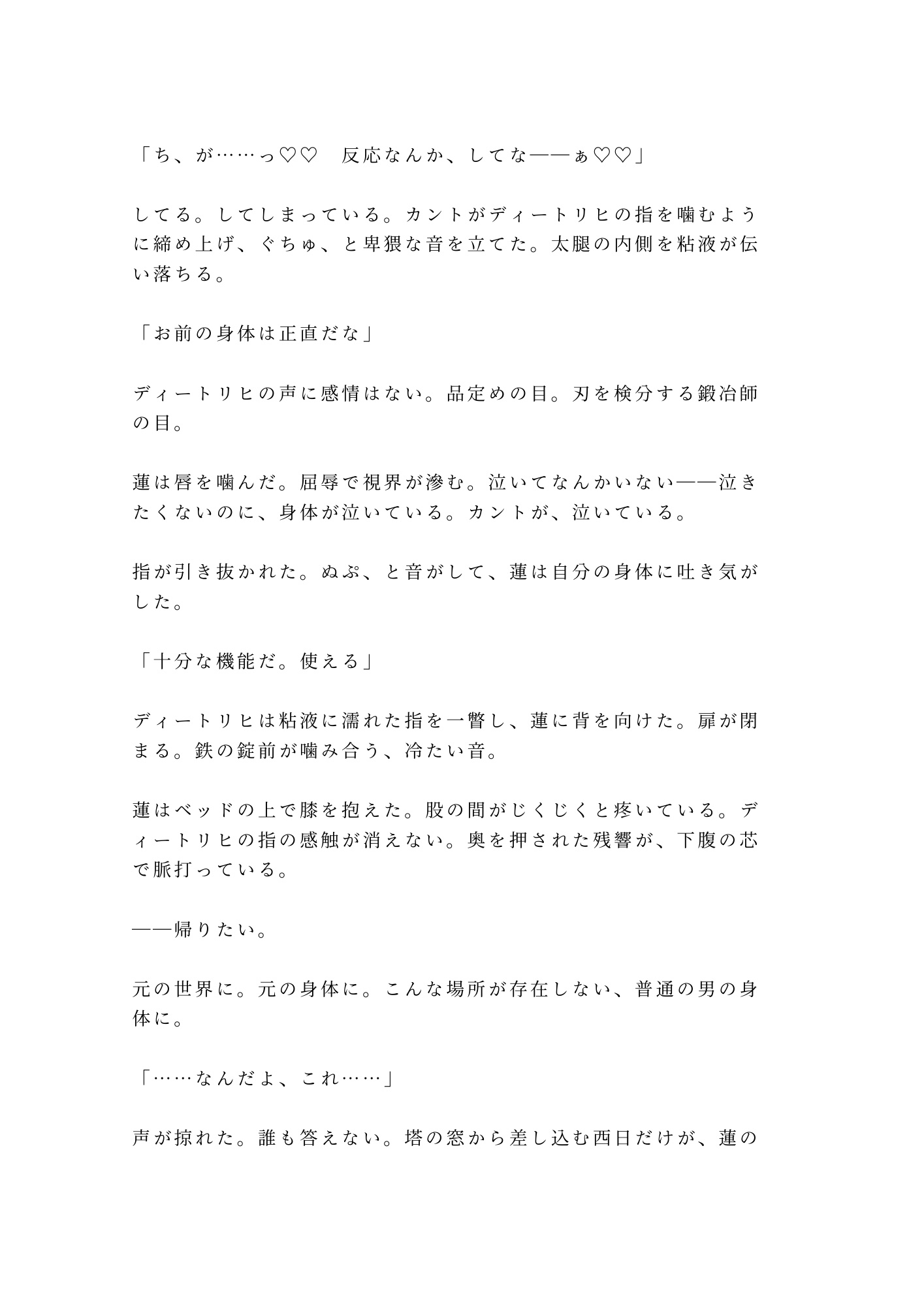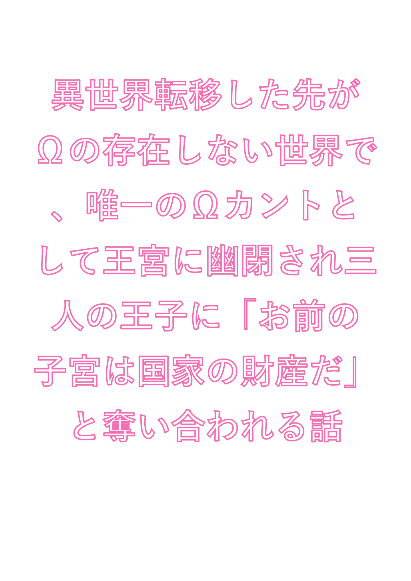 異世界転移した瞬間、身体にΩのカントが刻まれた。この世界にΩは存在しない——つまり、蓮は唯一の「産める身体」。王宮の塔に幽閉され、三人の王子が蓮のカントを奪い合う。冷徹な第一王子は「道具」として査定し、学者肌の第二王子は「標本」として計測し、そして第三王子は——。「お前の子宮は国家の財産だ」。逃げ場なし、拒否権なし。元男の身体が、王子たちに暴かれ蕩かされていく異世界カント争奪BL