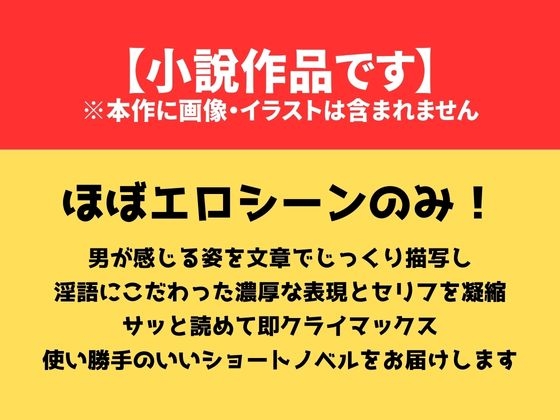 ほぼエロシーンのみ! シチュエーションだけで、めんどうなストーリーはありません。長編でも読み返すのは結局エロいところだけだな……と思ったので、読みたいと思えるものだけを凝縮しました。短いですが、そのぶん濃厚。男が感じる姿を文章でじっくり描写し、淫語にこだわった濃厚なエロ表現とセリフをこってり詰め込みました。また、さし絵を含まない文章作品なのでビジュアルは想像どおり、100%好みに合ったイメージの世界をジャマしません。ヌキたいときにサッと読めて即クライマックス! 使い勝手のいいショートノベルをお楽しみください。