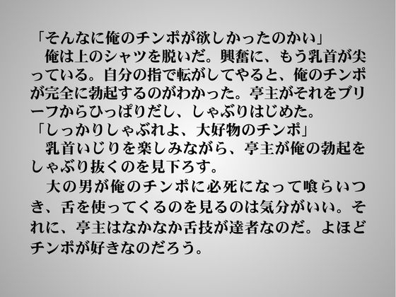 酒屋の店主は休日に得意先の亭主に呼ばれる。妻がいない日、亭主は店主のカラダが欲しくて連絡してくるのだ。亭主の求めるままに、酒屋の店主は亭主にザーメンを飲ませてやり、ケツを犯してさんざんよがらせるのだ。