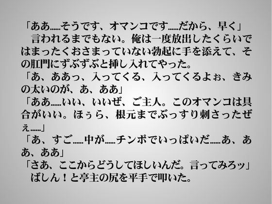 酒屋の店主は休日に得意先の亭主に呼ばれる。亭主は店主のカラダが欲しくて連絡してくるのだ。亭主の求めるままに、酒屋の店主は亭主にザーメンを飲ませてやり、ケツを犯してさんざんよがらせるのだ。