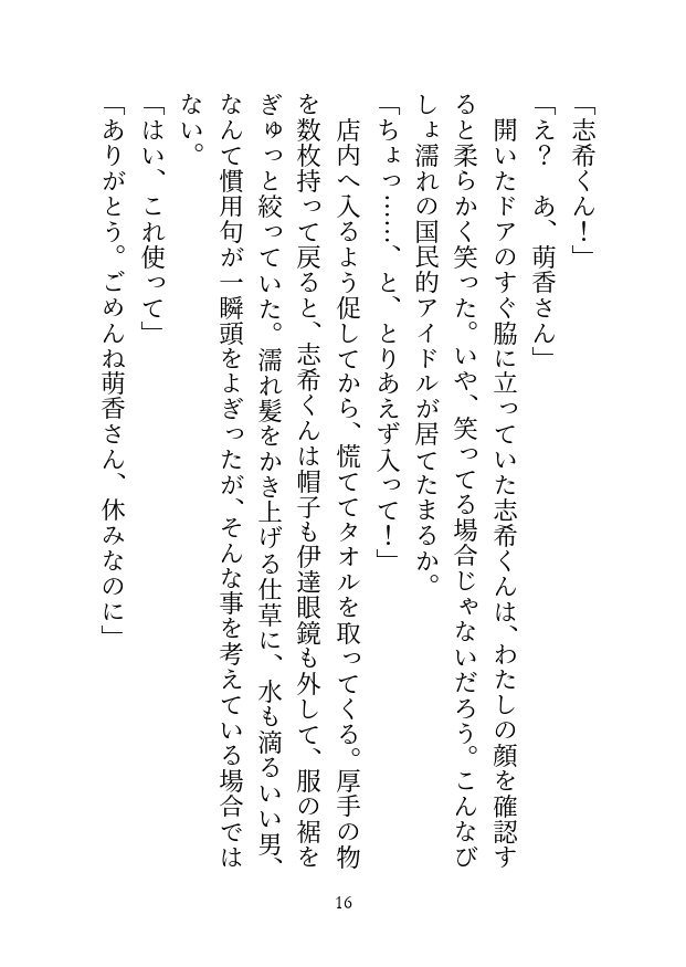 レトロな喫茶店で店長として働く萌香。店の常連客の一人である志希は、数年前にデビューした人気アイドルであり、忙しい彼にちょっとした寛ぎの時間を提供している。或る雨の日、定休日である店の前に、ずぶ濡れの志希が現れて……。