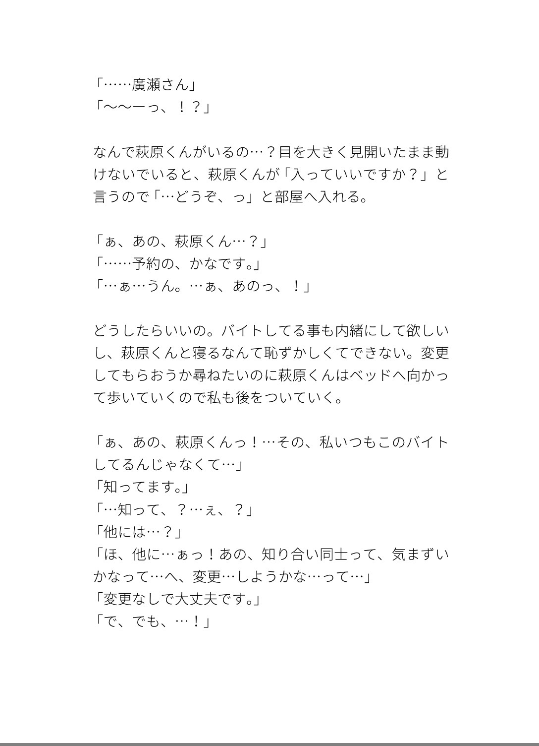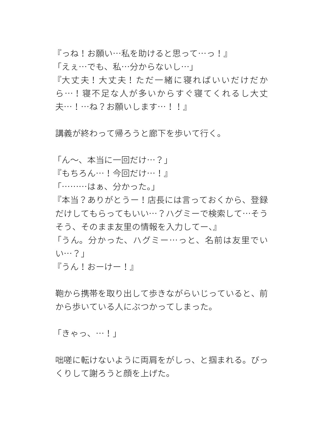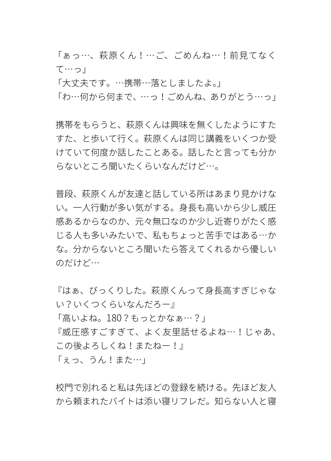 添い寝ソフレを友達に頼まれて一回だけ引き受けたら同じ学科の萩原くんが来て…動けないよう抱きしめられながら乳首連続イキ、確認と称してクリ責めから潮吹き、体格差で身動きできないまま中出しされるお話です。