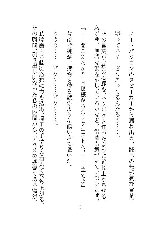 最新式のクリトリス吸引バイブが、断続的に剥き出しのクリトリスを吸い上げ、狡猾な義兄の指とディルドが、ナカを子宮ごと蹂躙していく。画面が揺れないよう必死にPCを掴み、絶頂を押し殺す。夫の優しい言葉が、義兄に汚される快感のスパイスとなり、一回、また一回と、絶頂の数をふやしていく。