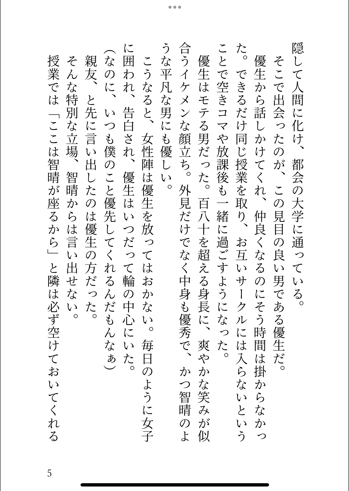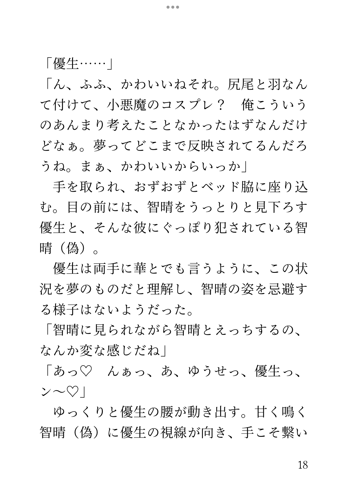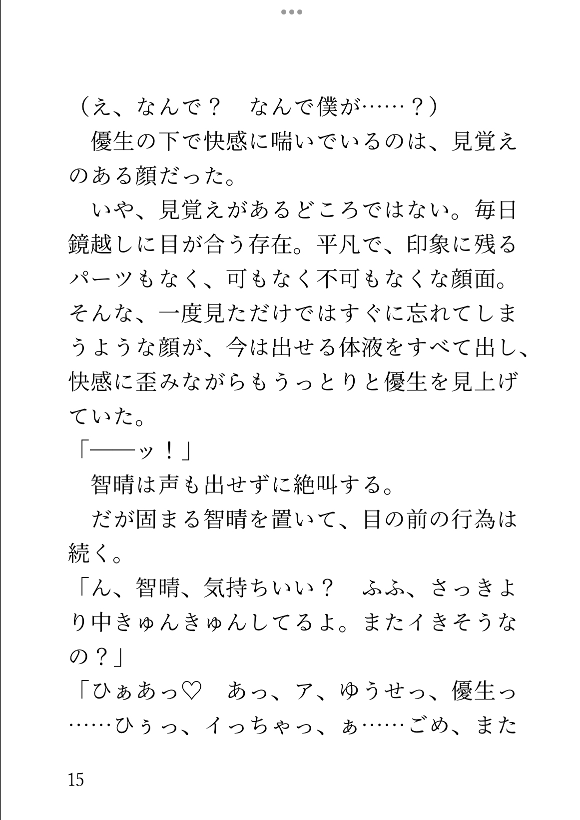 少しの気まずさを抱えながらも向かった智晴は、そこで犯されているのが自分なことに気づく。甘い声を上げながら優生に揺さぶられている、夢の中の幻の自分。たっぷりと腹の中に精液を出されるその偽物に、智晴は気づけば嫉妬を覚えていた。