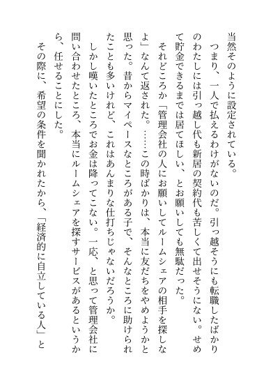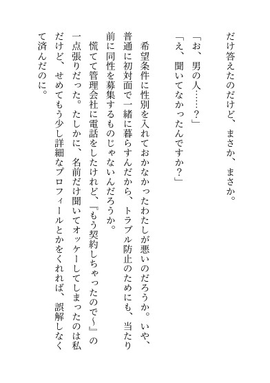 ルームシェアをしていた親友が、彼氏との同棲を理由に急遽退去。 転職したての由紀に残された選択肢は、新しい同居人を募集することだけだった。